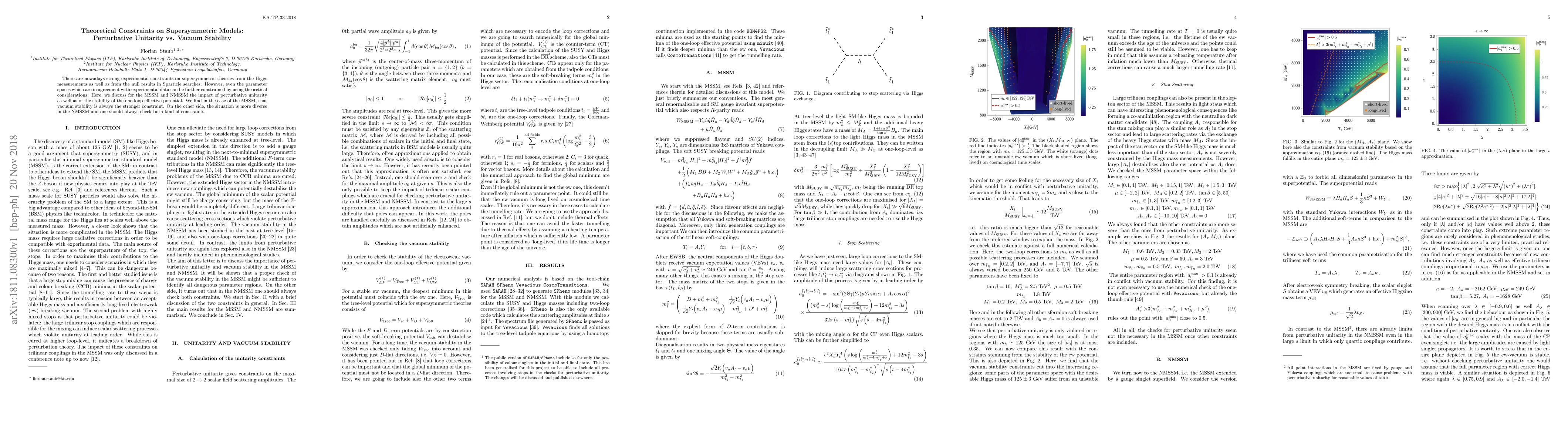 This paper examines the theoretical constraints on supersymmetric models, specifically the Minimal Supersymmetric Standard Model (MSSM) and the Next-to-Minimal Supersymmetric Standard Model (NMSSM), focusing on perturbative unitarity and vacuum stability. It finds that for the MSSM, vacuum stability is the more stringent constraint, while in the NMSSM, both perturbative unitarity and vacuum stability must be considered.
