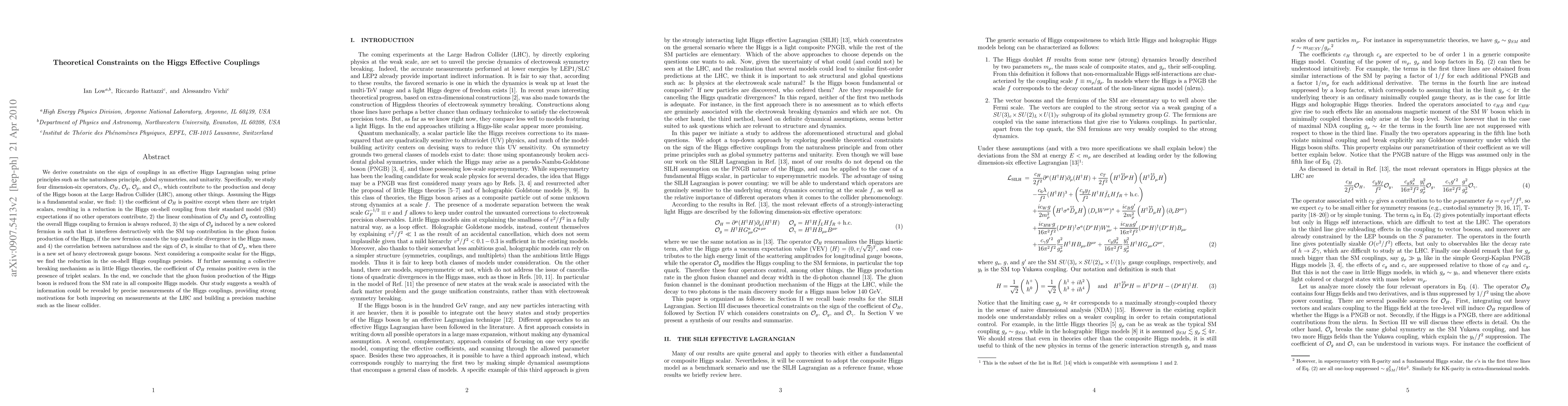 We derive constraints on the sign of couplings in an effective Higgs Lagrangian using prime principles such as the naturalness principle, global symmetries, and unitarity. Specifically, we study four dimension-six operators, O_H, O_y, O_g, and O_gamma, which contribute to the production and decay of the Higgs boson at the Large Hadron Collider (LHC), among other things. Assuming the Higgs is a fundamental scalar, we find: 1) the coefficient of O_H is positive except when there are triplet scalars, resulting in a reduction in the Higgs on-shell coupling from their standard model (SM) expectations if no other operators contribute, 2) the linear combination of O_H and O_y controlling the overall Higgs coupling to fermion is always reduced, 3) the sign of O_g induced by a new colored fermion is such that it interferes destructively with the SM top contribution in the gluon fusion production of the Higgs, if the new fermion cancels the top quadratic divergence in the Higgs mass, and 4) the correlation between naturalness and the sign of O_gamma is similar to that of O_g, when there is a new set of heavy electroweak gauge bosons. Next considering a composite scalar for the Higgs, we find the reduction in the on-shell Higgs couplings persists. If further assuming a collective breaking mechanism as in little Higgs theories, the coefficient of O_H remains positive even in the presence of triplet scalars. In the end, we conclude that the gluon fusion production of the Higgs boson is reduced from the SM rate in all composite Higgs models. Our study suggests a wealth of information could be revealed by precise measurements of the Higgs couplings, providing strong motivations for both improving on measurements at the LHC and building a precision machine such as the linear collider.
