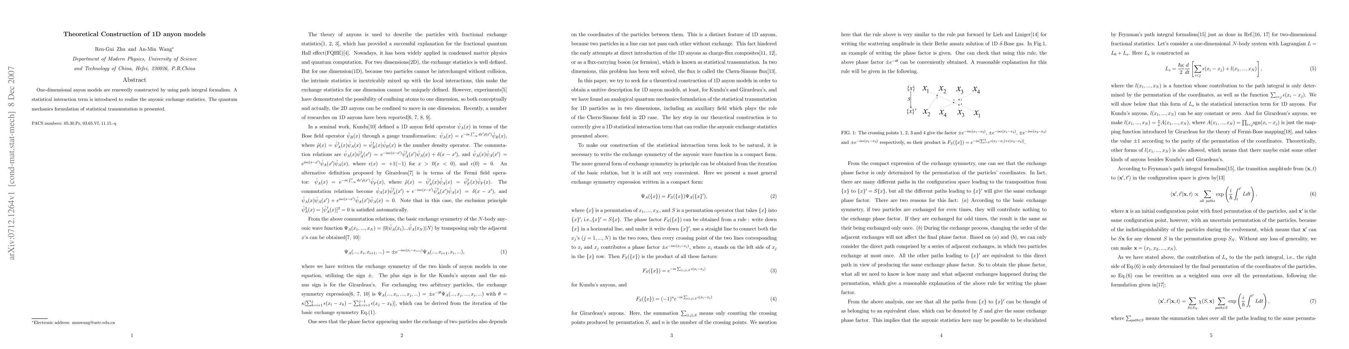 The paper constructs 1D anyon models using path integral formalism, introducing a statistical interaction term to realize anyonic exchange statistics and presenting a quantum mechanics formulation of statistical transmutation.