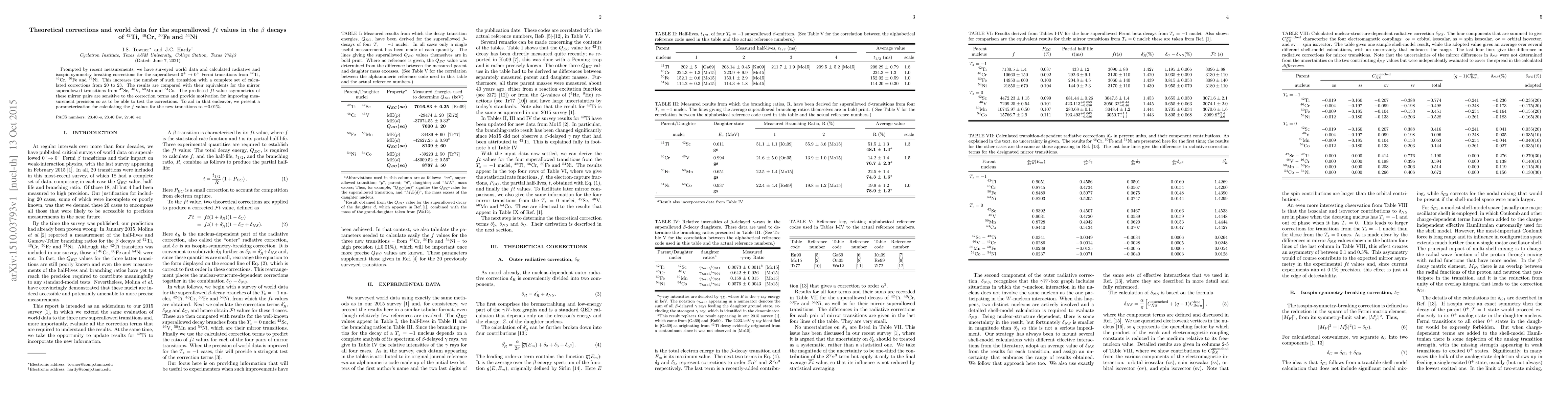 Prompted by recent measurements, we have surveyed world data and calculated radiative and isospin-symmetry breaking corrections for the superallowed 0+ -to- 0+ Fermi transitions from 42Ti, 46Cr, 50Fe and 54Ni. This increases the number of such transition with a complete set of calculated corrections from 20 to 23. The results are compared with their equivalents for the mirror superallowed transitions from 42Sc, 46V, 50Mn and 54Co. The predicted ft-value asymmetries of these mirror pairs are sensitive to the correction terms and provide motivation for improving measurement precision so as to be able to test the corrections. To aid in that endeavor, we present a parameterization for calculating the f values for the new transitions to plus/minus 0.01%.