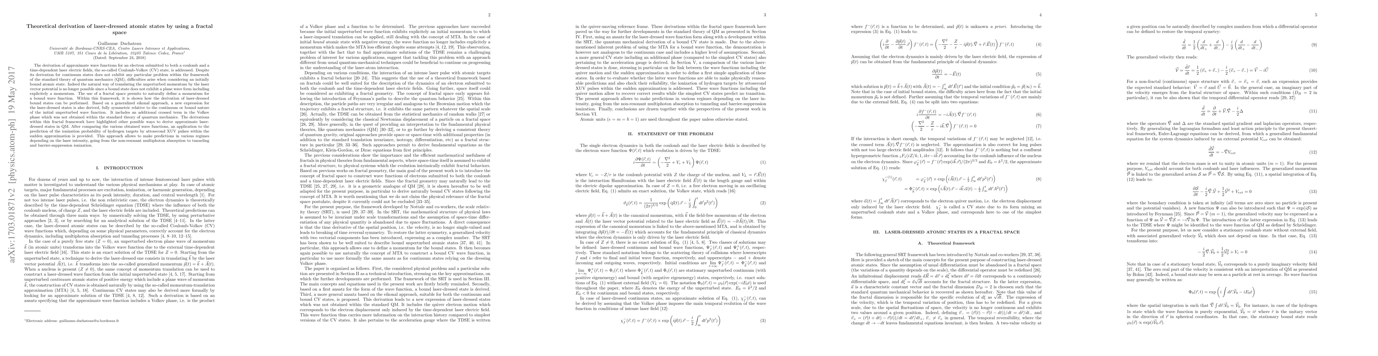 The derivation of approximate wave functions for an electron submitted to both a coulomb and a time-dependent laser electric fields, the so-called Coulomb-Volkov (CV) state, is addressed. Despite its derivation for continuum states does not exhibit any particular problem within the framework of the standard theory of quantum mechanics (QM), difficulties arise when considering an initially bound atomic state. Indeed the natural way of translating the unperturbed momentum by the laser vector potential is no longer possible since a bound state does not exhibit a plane wave form including explicitely a momentum. The use of a fractal space permits to naturally define a momentum for a bound wave function. Within this framework, it is shown how the derivation of laser-dressed bound states can be performed. Based on a generalized eikonal approach, a new expression for the laser-dressed states is also derived, fully symmetric relative to the continuum or bound nature of the initial unperturbed wave function. It includes an additional crossed term in the Volkov phase which was not obtained within the standard theory of quantum mechanics. The derivations within this fractal framework have highlighted other possible ways to derive approximate laser-dressed states in QM. After comparing the various obtained wave functions, an application to the prediction of the ionization probability of hydrogen targets by attosecond XUV pulses within the sudden approximation is provided. This approach allows to make predictions in various regimes depending on the laser intensity, going from the non-resonant multiphoton absorption to tunneling and barrier-suppression ionization.