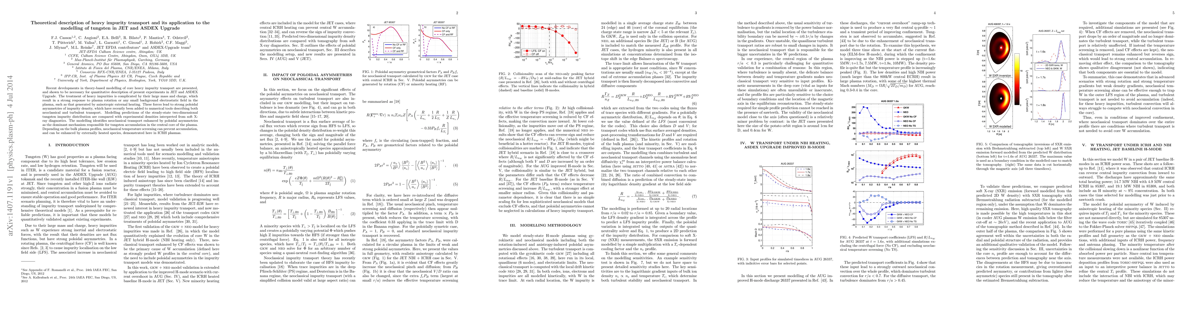 This paper presents a theoretical model for heavy impurity transport, specifically tungsten, in fusion devices JET and ASDEX Upgrade. The model accounts for poloidal asymmetries due to impurity mass and charge, showing that neoclassical transport is the primary mechanism for central core accumulation.