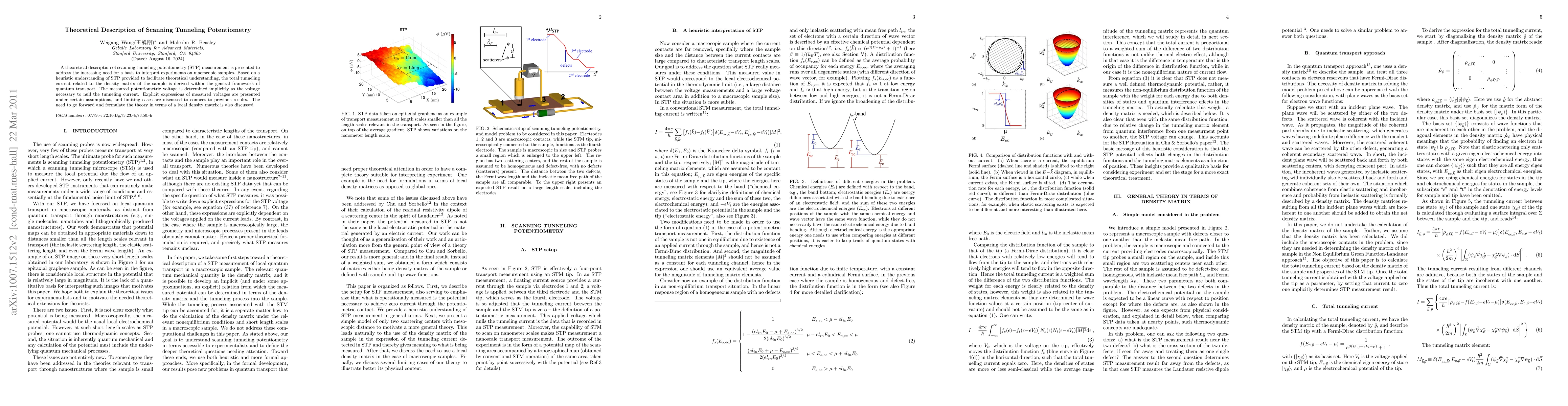 A theoretical description of scanning tunneling potentoimetry (STP) measurement is presented to address the increasing need for a basis to interpret experiments on macrscopic samples. Based on a heuristic understanding of STP provided to facilitate theoretical understanding, the total tunneling current related to the density matrix of the sample is derived within the general framework of quantum transport. The measured potentiometric voltage is determined implicitly as the voltage necessary to null the tunneling current. Explicit expressions of measured voltages are presented under certain assumptions, and limiting cases are discussed to connect to previous results. The need to go forward and formulate the theory in terms of a local density matrix is also discussed.