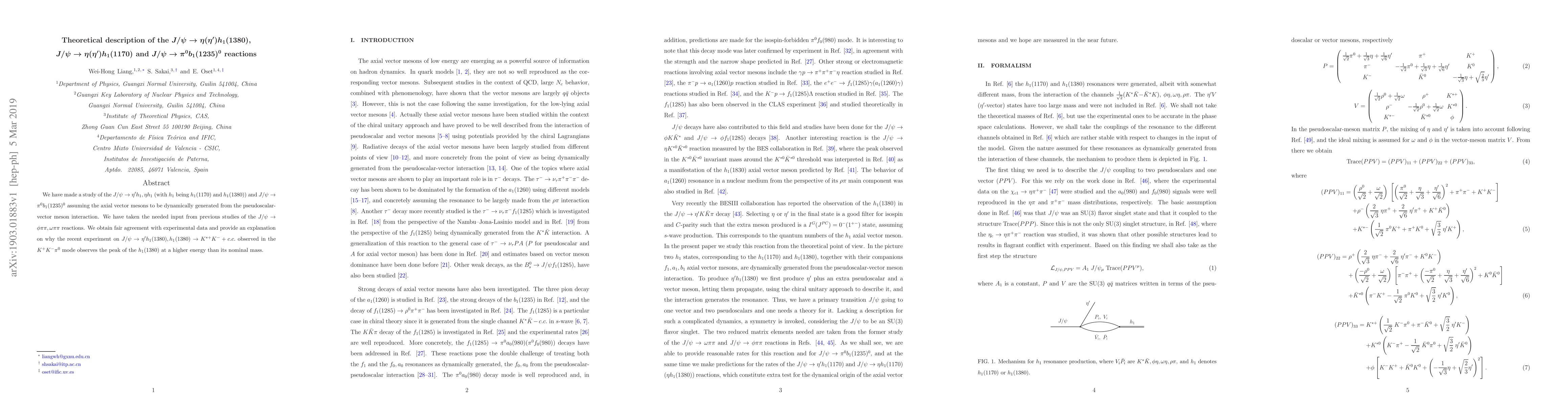 We have made a study of the $J/\psi \to \eta' h_1, \eta h_1$ (with $h_1$ being $h_1(1170)$ and $h_1(1380)$) and $J/\psi \to \pi^0 b_1(1235)^0$ assuming the axial vector mesons to be dynamically generated from the pseudoscalar-vector meson interaction. We have taken the needed input from previous studies of the $J/\psi \to \phi \pi \pi, \omega \pi \pi$ reactions. We obtain fair agreement with experimental data and provide an explanation on why the recent experiment on $J/\psi \to \eta' h_1(1380), h_1(1380) \to K^{*+} K^- +c.c.$ observed in the $K^+ K^- \pi^0$ mode observes the peak of the $h_1(1380)$ at a higher energy than its nominal mass.