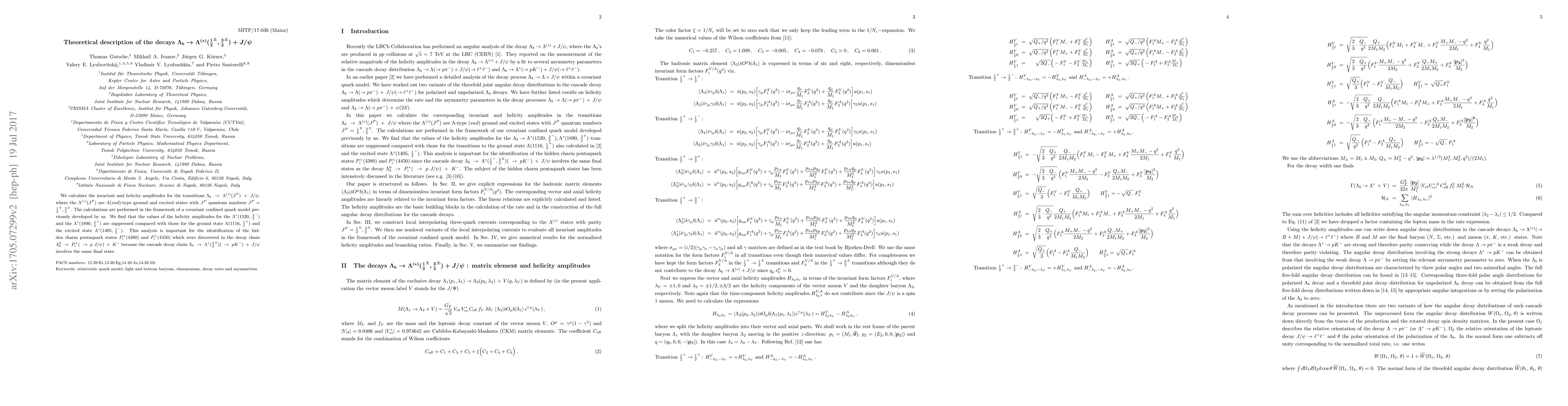 We calculate the invariant and helicity amplitudes for the transitions $\Lambda_b~\to~\Lambda^{(\ast)}(J^P)~+~J/\psi$ where the $\Lambda^{(\ast)}(J^P)$ are $\Lambda(sud)$-type ground and excited states with $J^P$ quantum numbers $J^P=\frac12^{\pm},\frac32^{\pm}$. The calculations are performed in the framework of a covariant confined quark model previously developed by us. We find that the values of the helicity amplitudes for the $\Lambda^\ast(1520,\,\frac32^-)$ and the $\Lambda^\ast(1890,\,\frac32^+)$ are suppressed compared with those for the ground state $\Lambda(1116,\,\frac12^+)$ and the excited state $\Lambda^\ast(1405,\,\frac12^-)$. This analysis is important for the identification of the hidden charm pentaquark states $P_c^+(4380)$ and $P_c^+(4450)$ which were discovered in the decay chain $\Lambda_b^0~\to~P_c^+(~\to~p~J/\psi)~+~K^- $ because the cascade decay chain $\Lambda_b~\to~\Lambda^\ast(\frac32^\pm)(~\to~pK^-)~+~J/\psi$ involves the same final state.