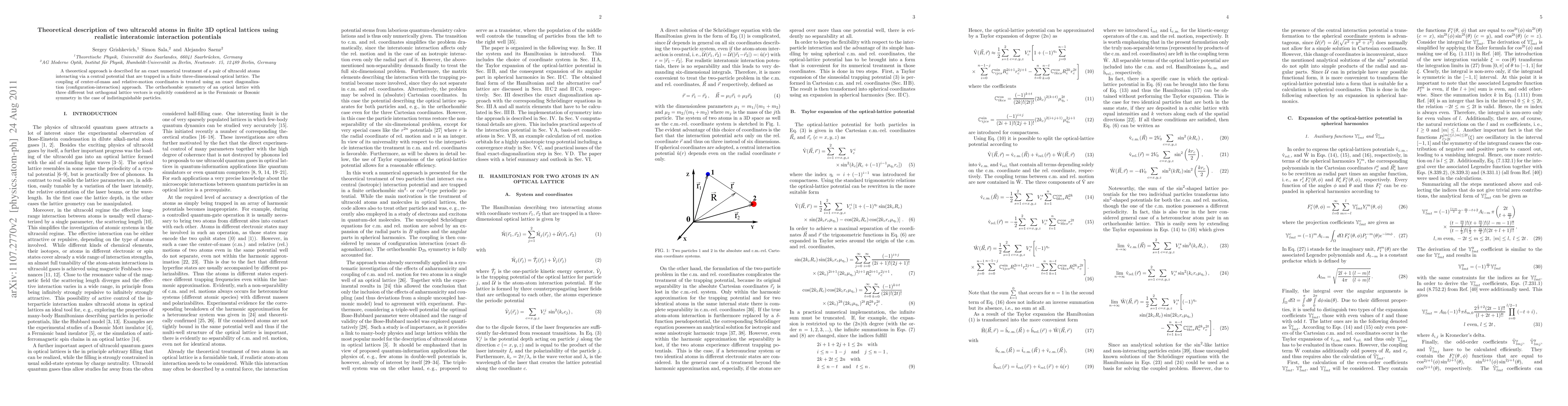 A theoretical approach is described for an exact numerical treatment of a pair of ultracold atoms interacting via a central potential that are trapped in a finite three-dimensional optical lattice. The coupling of center-of-mass and relative-motion coordinates is treated using an exact diagonalization (configuration-interaction) approach. The orthorhombic symmetry of an optical lattice with three different but orthogonal lattice vectors is explicitly considered as is the Fermionic or Bosonic symmetry in the case of indistinguishable particles.