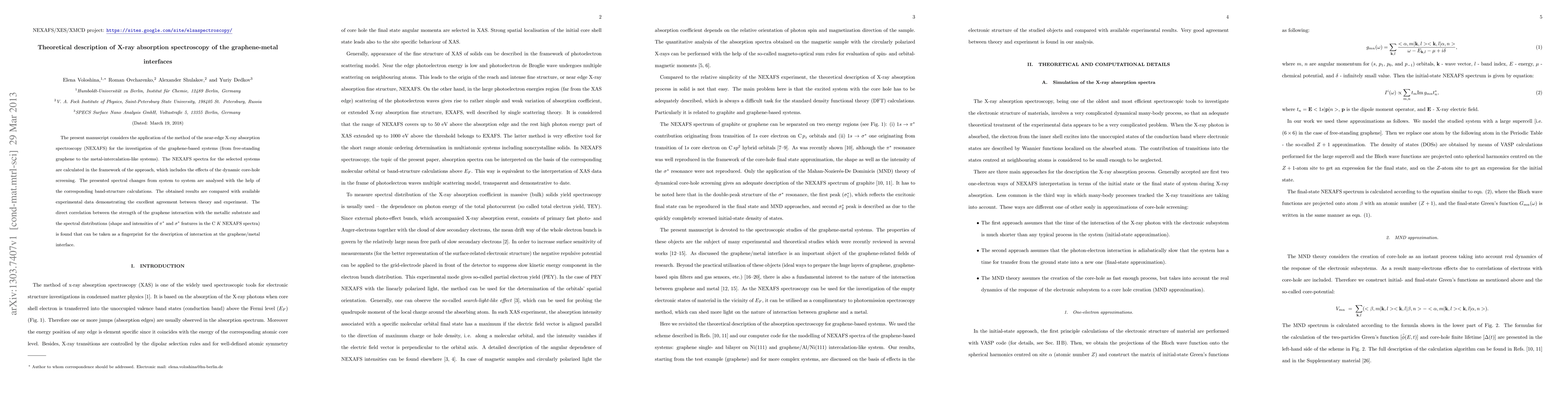 The present manuscript considers the application of the method of the near-edge X-ray absorption spectroscopy (NEXAFS) for the investigation of the graphene-based systems (from free-standing graphene to the metal-intercalation-like systems). The NEXAFS spectra for the selected systems are calculated in the framework of the approach, which includes the effects of the dynamic core-hole screening. The presented spectral changes from system to system are analysed with the help of the corresponding band-structure calculations. The obtained results are compared with available experimental data demonstrating the excellent agreement between theory and experiment. The direct correlation between the strength of the graphene interaction with the metallic substrate and the spectral distributions (shape and intensities of \pi* and \sigma* features in the C K NEXAFS spectra) is found that can be taken as a fingerprint for the description of interaction at the graphene/metal interface.