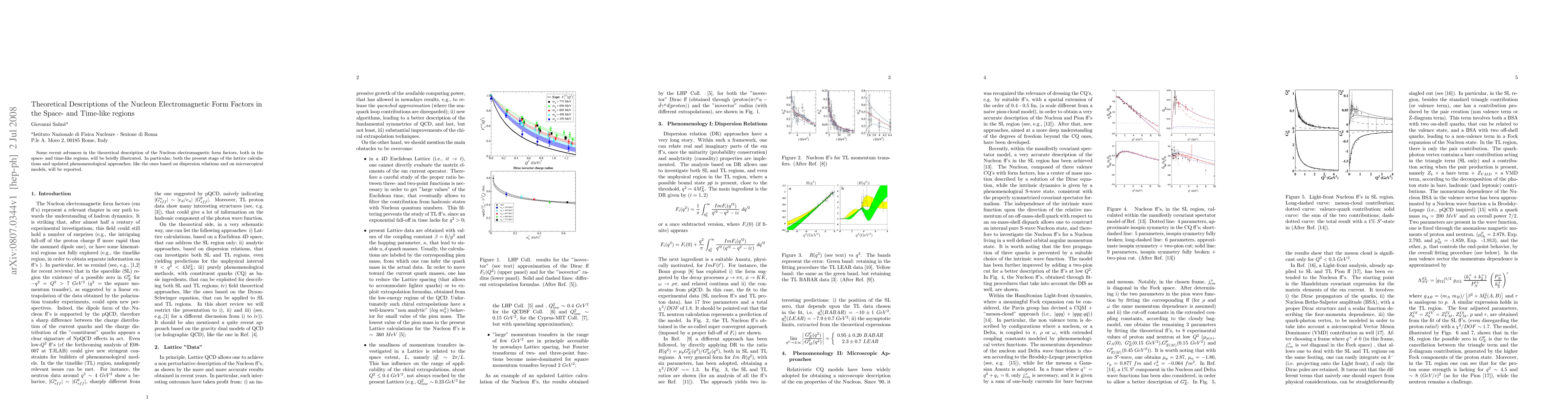 This paper reviews recent theoretical advancements in nucleon electromagnetic form factors, focusing on lattice calculations and updated phenomenological approaches, including dispersion relations and microscopic models, for both space- and time-like regions.