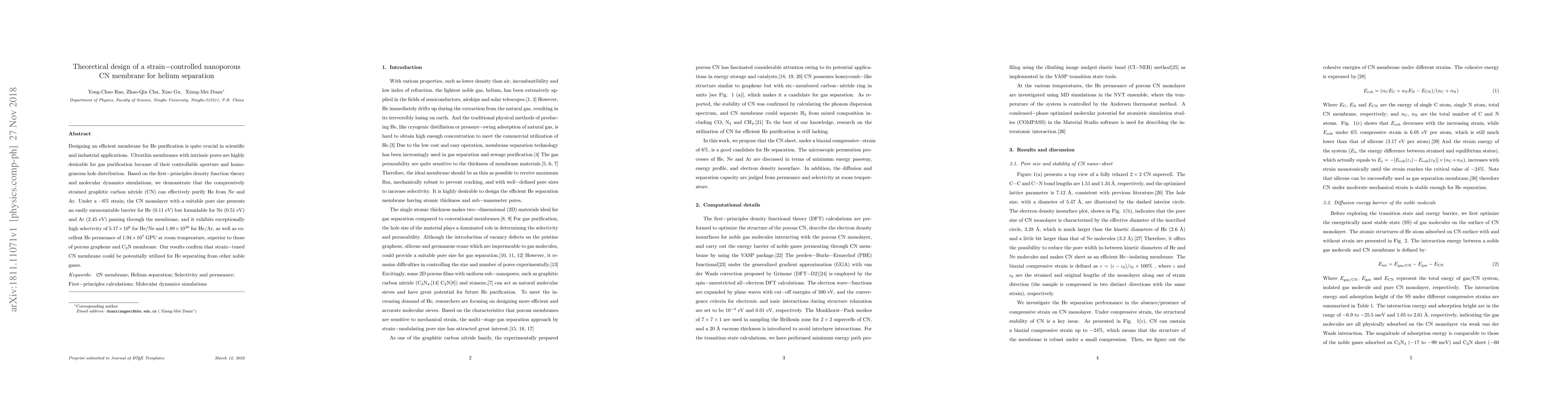 This paper proposes a strain-controlled nanoporous carbon nitride (CN) membrane for helium separation, demonstrating high selectivity and permeance through density functional theory and molecular dynamics simulations. The -6% strained CN monolayer shows exceptional performance in separating He from Ne and Ar, achieving unprecedented selectivity and permeance values.