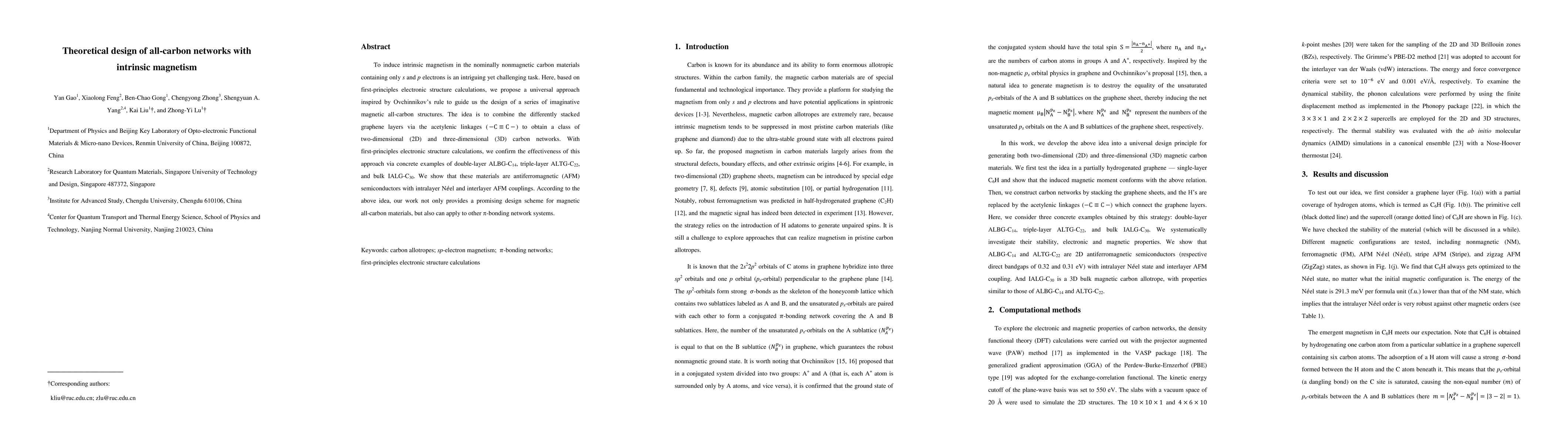 To induce intrinsic magnetism in the nominally nonmagnetic carbon materials containing only $s$ and $p$ electrons is an intriguing yet challenging task. Here, based on first-principles electronic structure calculations, we propose a universal approach inspired by Ovchinnikov's rule to guide us the design of a series of imaginative magnetic all-carbon structures. The idea is to combine the differently stacked graphene layers via the acetylenic linkages (-C$\equiv$C-) to obtain a class of two-dimensional (2D) and three-dimensional (3D) carbon networks. With first-principles electronic structure calculations, we confirm the effectiveness of this approach via concrete examples of double-layer ALBG-C14, triple-layer ALTG-C22, and bulk IALG-C30. We show that these materials are antiferromagnetic (AFM) semiconductors with intralayer N\'eel and interlayer AFM couplings. According to the above idea, our work not only provides a promising design scheme for magnetic all-carbon materials, but also can apply to other $\pi$-bonding network systems.
