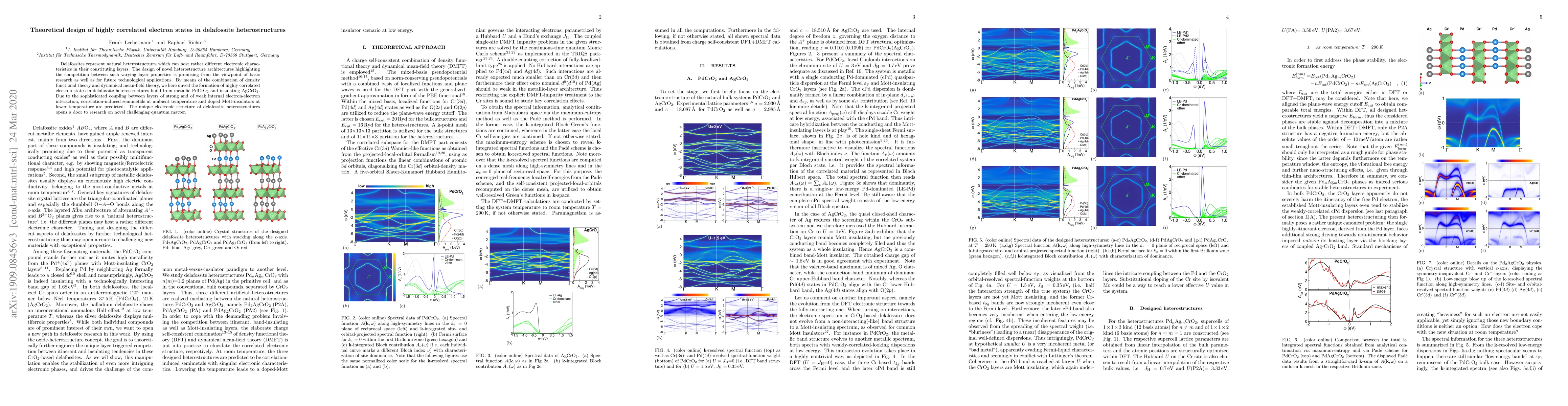 This paper explores the theoretical design of delafossite heterostructures, combining metallic PdCrO$_2$ and insulating AgCrO$_2$, to reveal highly correlated electron states using density functional theory and dynamical mean-field theory. The study predicts the formation of correlation-induced semimetals and doped Mott-insulators, highlighting potential for advanced quantum material research.