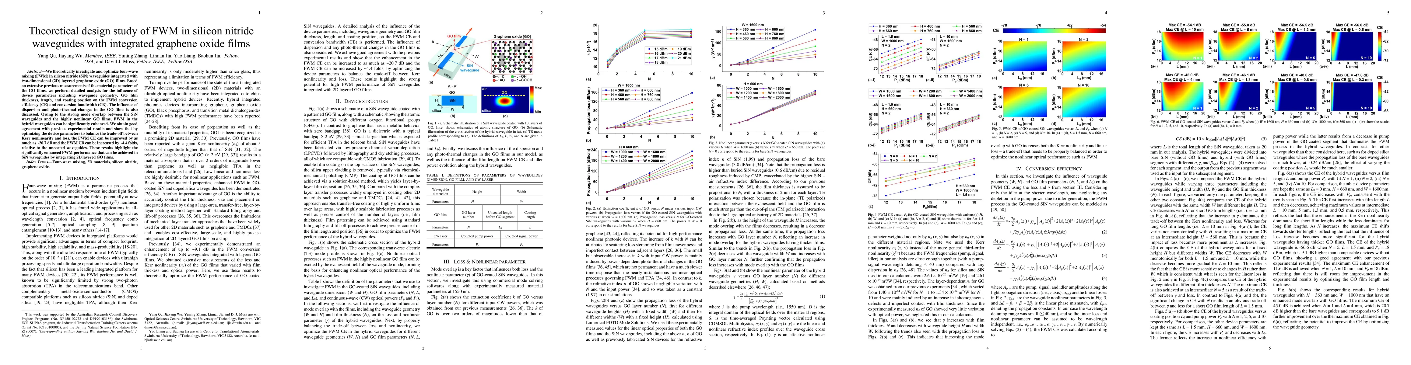 This study theoretically explores and optimizes four-wave mixing (FWM) in silicon nitride waveguides with integrated graphene oxide films, demonstrating significant enhancements in FWM conversion efficiency and bandwidth by optimizing device parameters. The study shows a ~20.7 dB improvement in FWM conversion efficiency and a ~4.4-fold increase in conversion bandwidth compared to uncoated waveguides.
