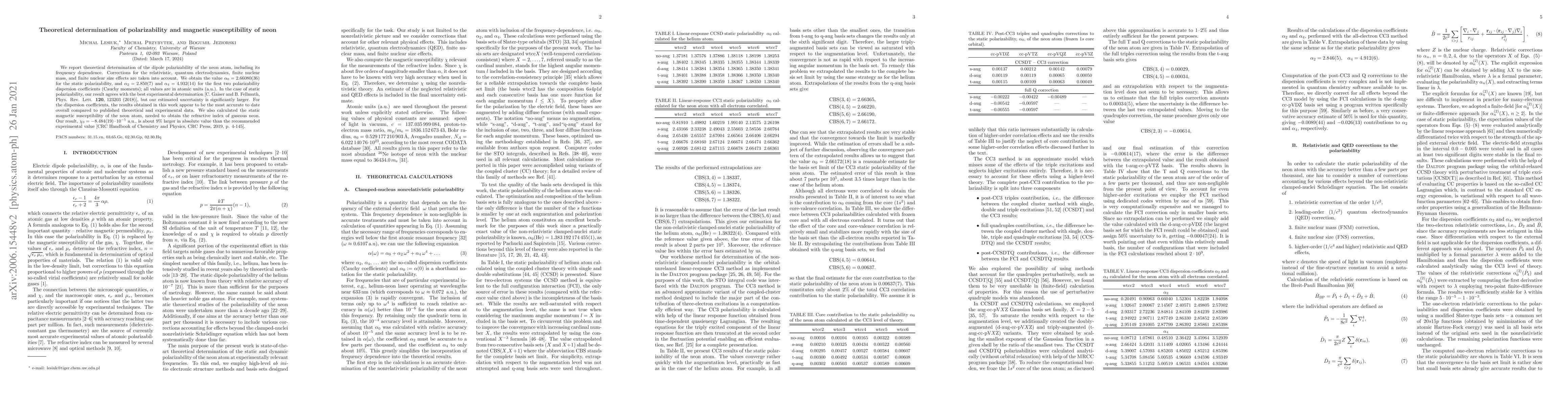 We report theoretical determination of the dipole polarizability of the neon atom, including its frequency dependence. Corrections for the relativistic, quantum electrodynamics, finite nuclear mass, and finite nuclear size effects are taken into account. We obtain the value $\alpha_0=2.66080(36)$ for the static polarizability, and $\alpha_2=2.850(7)$ and $\alpha_4=4.932(14)$ for the first two polarizability dispersion coefficients (Cauchy moments); all values are in atomic units (a.u.). In the case of static polarizability, our result agrees with the best experimental determination [C. Gaiser and B. Fellmuth, Phys. Rev. Lett. 120, 123203 (2018)], but our estimated uncertainty is significantly larger. For the dispersion coefficients, the results obtained in this work appear to be the most accurate to date overall compared to published theoretical and experimental data. We also calculated the static magnetic susceptibility of the neon atom, needed to obtain the refractive index of gaseous neon. Our result, $\chi_0 = -8.484(19) \cdot 10^{-5}$ a.u., is about 9% larger in absolute value than the recommended experimental value [CRC Handbook of Chemistry and Physics, CRC Press, 2019, p. 4-145].