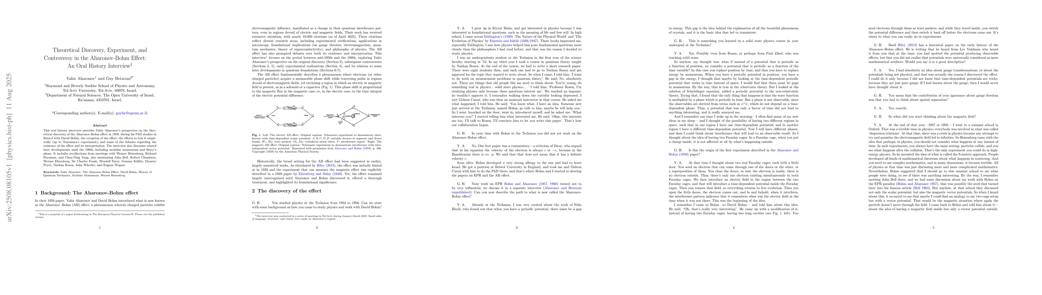 This oral history interview provides Yakir Aharonov's perspective on the theoretical discovery of the Aharonov-Bohm effect in 1959, during his PhD studies in Bristol with David Bohm, the reception of the effect, the efforts to test it empirically (up to Tonomura's experiment), and some of the debates regarding the existence of the effect and its interpretation. The interview also discusses related later developments until the 1980s, including modular momentum and Berry's phase. It includes recollections from meetings with Werner Heisenberg, Richard Feynman, and Chen-Ning Yang, also mentioning John Bell, Robert Chambers, Werner Ehrenberg, Sir Charles Frank, Wendell Furry, Gunnar K\"all\'en, Maurice Pryce, Nathan Rosen, John Wheeler, and Eugene Wigner.