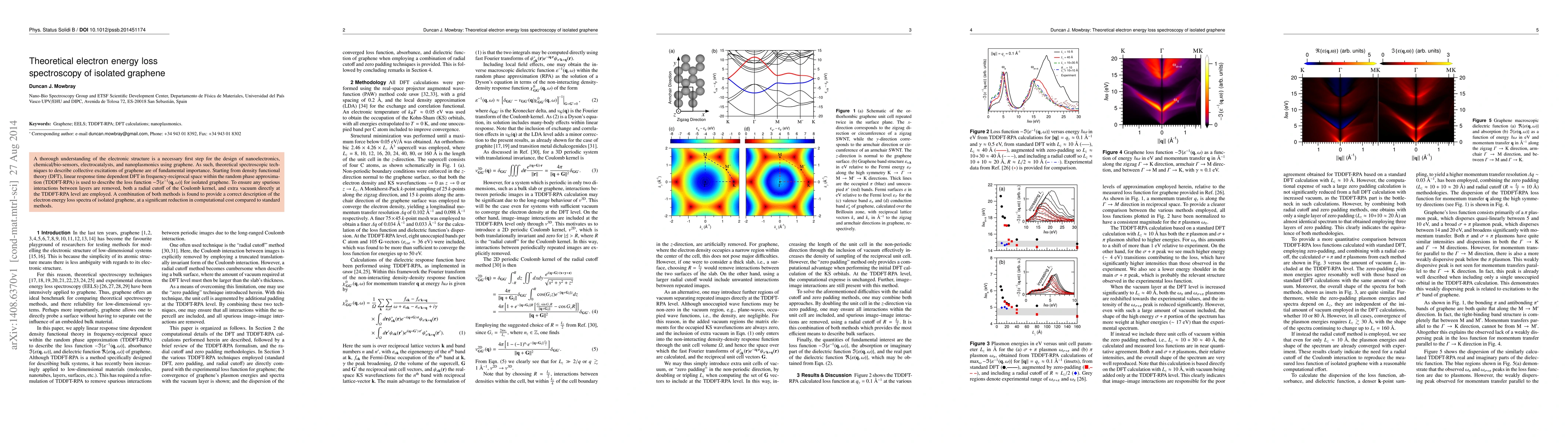 This paper employs theoretical spectroscopic techniques based on density functional theory and linear response time-dependent DFT within the random phase approximation to analyze the electron energy loss spectra of isolated graphene. The combination of radial cutoff and extra vacuum methods effectively eliminates spurious interactions, providing a cost-effective description of graphene's collective excitations.