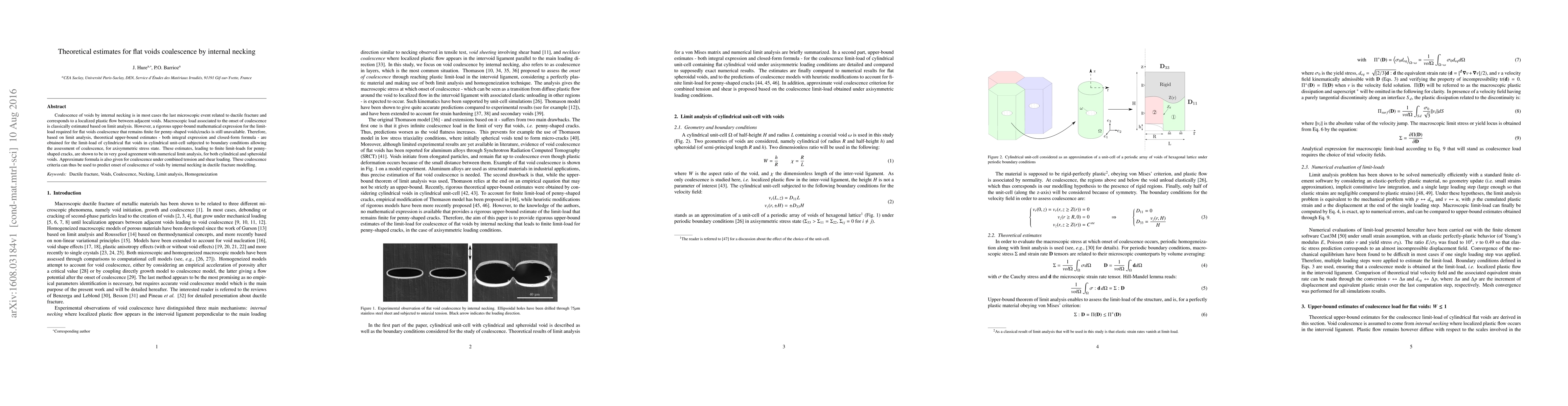 This paper provides theoretical upper-bound estimates for the limit-load required for coalescence of flat voids by internal necking, offering integral expressions and closed-form formulas that yield finite values for penny-shaped voids. The estimates are validated against numerical limit analysis and can predict the onset of void coalescence in ductile fracture models.