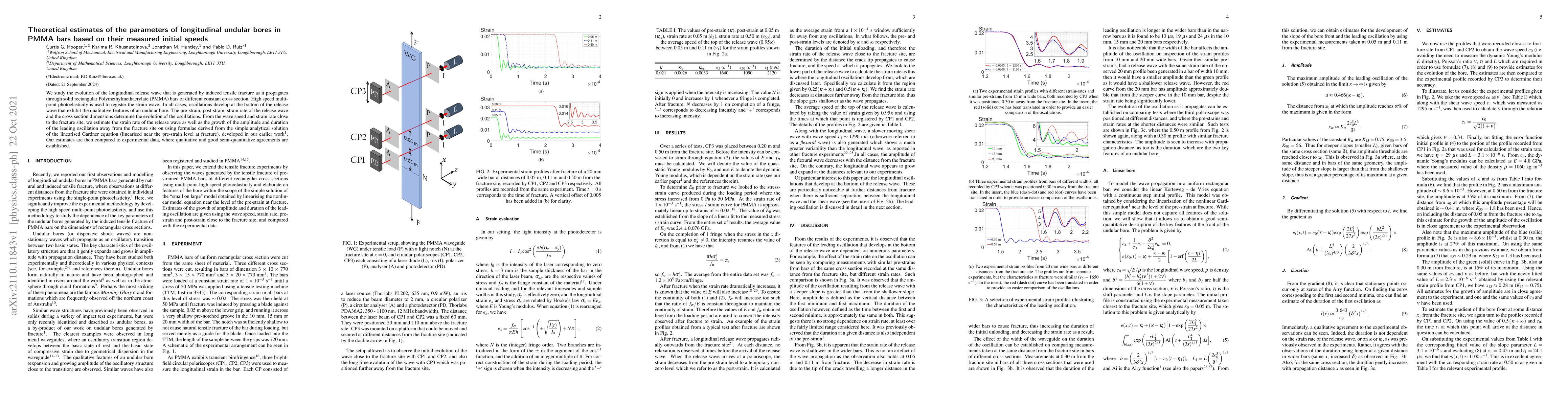 We study the evolution of the longitudinal release wave that is generated by induced tensile fracture as it propagates through solid rectangular Polymethylmethacrylate (PMMA) bars of different constant cross section. High speed multi-point photoelasticity is used to register the strain wave. In all cases, oscillations develop at the bottom of the release wave that exhibit the qualitative features of an undular bore. The pre-strain, post-strain, strain rate of the release wave and the cross section dimensions determine the evolution of the oscillations. From the wave speed and strain rate close to the fracture site, we estimate the strain rate of the release wave as well as the growth of the amplitude and duration of the leading oscillation away from the fracture site on using formulae derived from the simple analytical solution [1] of the linearised Gardner equation (linearised near the pre-strain level at fracture), developed in our earlier work . Our estimates are then compared to experimental data, where qualitative and good semi-quantitative agreements are established.