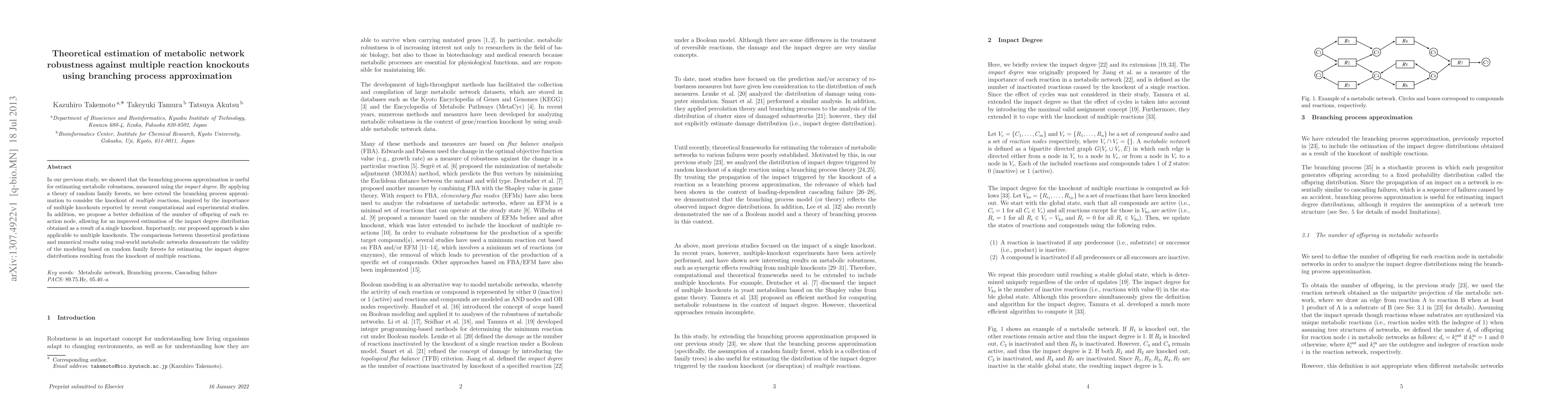 This paper extends the branching process approximation to estimate metabolic network robustness against multiple reaction knockouts, using a theory of random family forests. The improved definition of reaction node offspring enhances the estimation of impact degree distributions, validated by comparisons with real-world metabolic networks.