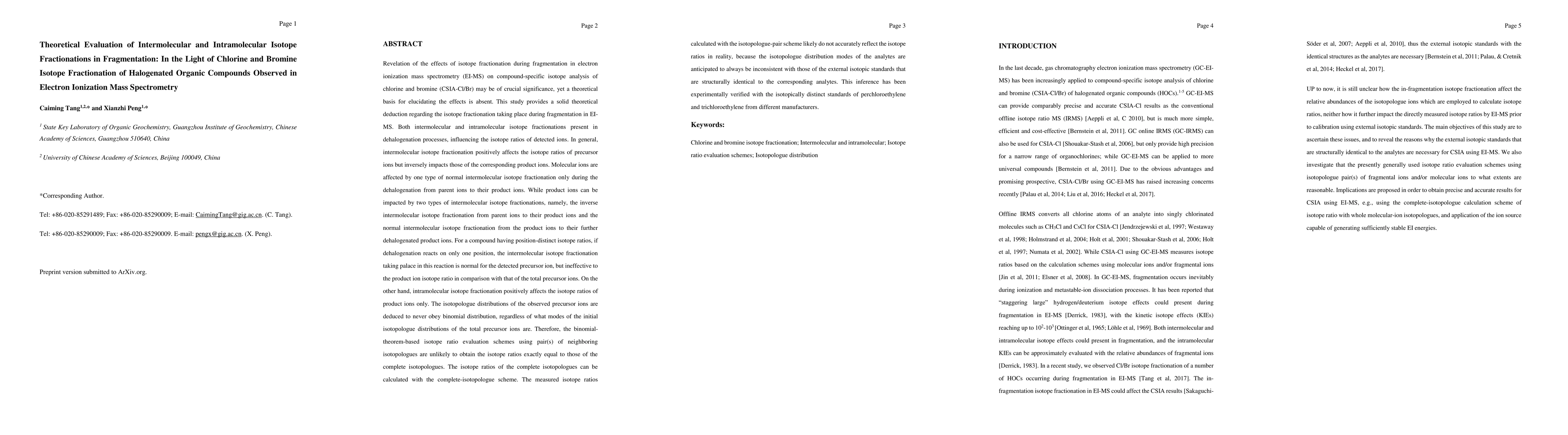 Revelation of the effects of isotope fractionation during fragmentation in electron ionization mass spectrometry (EI-MS) on compound-specific isotope analysis of chlorine and bromine (CSIA-Cl/Br) may be of crucial significance, yet a theoretical basis for elucidating the effects is absent. This study provides a solid theoretical deduction regarding the isotope fractionation taking place during fragmentation in EI-MS. Both intermolecular and intramolecular isotope fractionations present in dehalogenation processes, influencing the isotope ratios of detected ions. In general, intermolecular isotope fractionation positively affects the isotope ratios of precursor ions but inversely impacts those of the corresponding product ions. Molecular ions are normally affected by one type of intermolecular isotope fractionation only during the dehalogenation from parent ions to their product ions. While product ions can be impacted by two types of intermolecular isotope fractionations, namely, the inverse intermolecular isotope fractionation from parent ions to their product ions and the normal intermolecular isotope fractionation from the product ions to their further dehalogenated product ions. For a compound having position-distinct isotope ratios, if dehalogenation reacts on only one position, the intermolecular isotope fractionation taking palace in this reaction is normal for the detected precursor ion, but ineffective to the product ion isotope ratio in comparison with that of the total precursor ions. On the other hand, intramolecular isotope fractionation positively affects the isotope ratios of product ions only. The chlorine isotopologues of the observed precursor ions are deduced to never obey binomial distribution, regardless of what modes of the initial isotopologue distributions of the total precursor ions are.