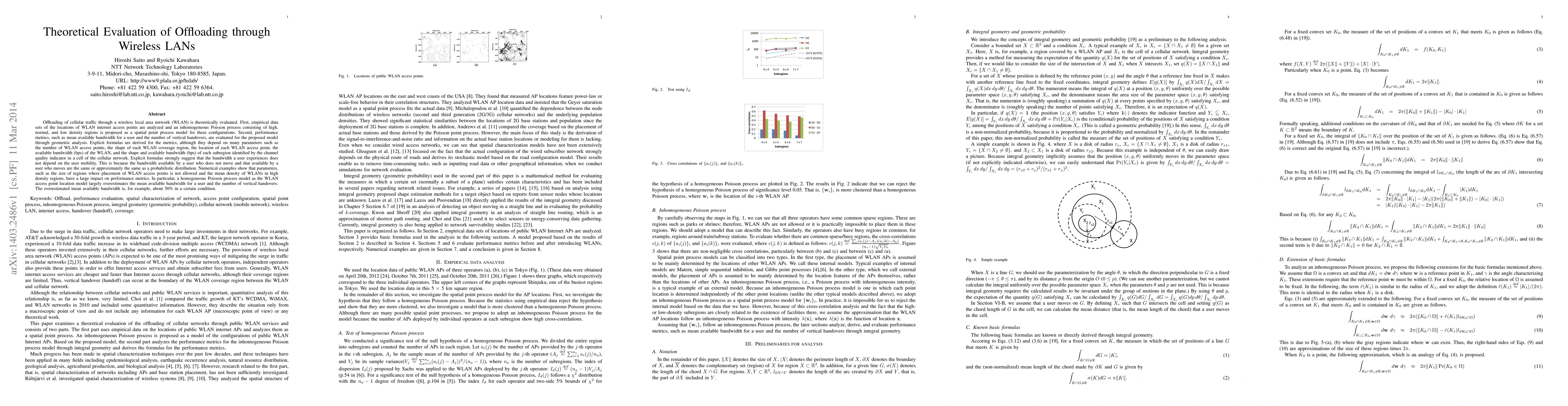 Offloading of cellular traffic through a wireless local area network (WLAN) is theoretically evaluated. First, empirical data sets of the locations of WLAN internet access points are analyzed and an inhomogeneous Poisson process consisting of high, normal, and low density regions is proposed as a spatial point process model for these configurations. Second, performance metrics, such as mean available bandwidth for a user and the number of vertical handovers, are evaluated for the proposed model through geometric analysis. Explicit formulas are derived for the metrics, although they depend on many parameters such as the number of WLAN access points, the shape of each WLAN coverage region, the location of each WLAN access point, the available bandwidth (bps) of the WLAN, and the shape and available bandwidth (bps) of each subregion identified by the channel quality indicator in a cell of the cellular network. Explicit formulas strongly suggest that the bandwidth a user experiences does not depend on the user mobility. This is because the bandwidth available by a user who does not move and that available by a user who moves are the same or approximately the same as a probabilistic distribution. Numerical examples show that parameters, such as the size of regions where placement of WLAN access points is not allowed and the mean density of WLANs in high density regions, have a large impact on performance metrics. In particular, a homogeneous Poisson process model as the WLAN access point location model largely overestimates the mean available bandwidth for a user and the number of vertical handovers. The overestimated mean available bandwidth is, for example, about 50% in a certain condition.