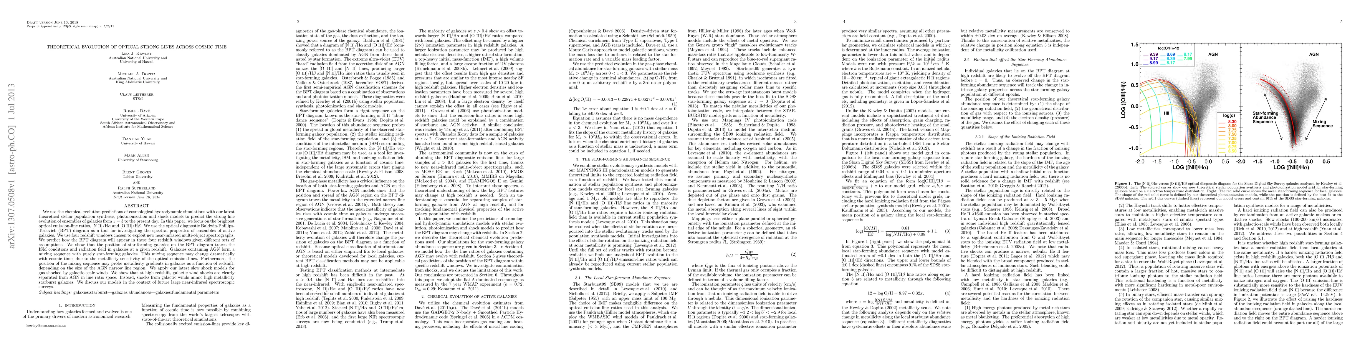 We use the chemical evolution predictions of cosmological hydrodynamic simulations with our latest theoretical stellar population synthesis, photoionization and shock models to predict the strong line evolution of ensembles of galaxies from z=3 to the present day. In this paper, we focus on the brightest optical emission-line ratios, [NII]/H-alpha and [OIII]/H-beta. We use the optical diagnostic Baldwin-Phillips-Terlevich (BPT) diagram as a tool for investigating the spectral properties of ensembles of active galaxies. We use four redshift windows chosen to exploit new near-infrared multi-object spectrographs. We predict how the BPT diagram will appear in these four redshift windows given different sets of assumptions. We show that the position of star-forming galaxies on the BPT diagram traces the ISM conditions and radiation field in galaxies at a given redshift. Galaxies containing AGN form a mixing sequence with purely star-forming galaxies. This mixing sequence may change dramatically with cosmic time, due to the metallicity sensitivity of the optical emission-lines. Furthermore, the position of the mixing sequence may probe metallicity gradients in galaxies as a function of redshift, depending on the size of the AGN narrow line region. We apply our latest slow shock models for gas shocked by galactic-scale winds. We show that at high redshift, galactic wind shocks are clearly separated from AGN in line ratio space. Instead, shocks from galactic winds mimic high metallicity starburst galaxies. We discuss our models in the context of future large near-infrared spectroscopic surveys.