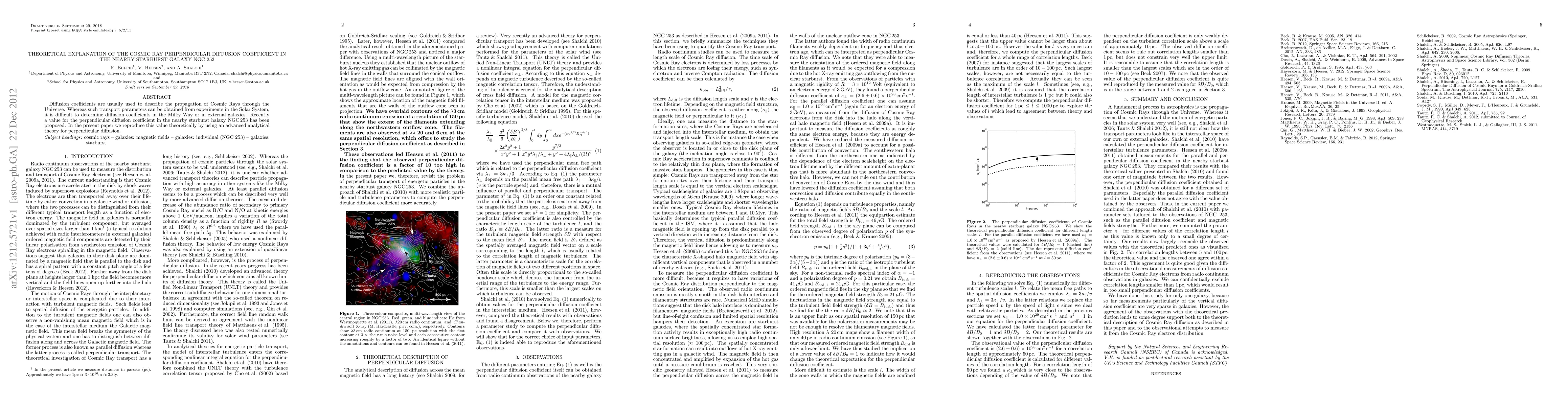 This paper theoretically reproduces the proposed perpendicular diffusion coefficient for cosmic rays in the nearby starburst galaxy NGC 253 using an advanced analytical model, providing a method to determine such transport parameters in external galaxies.