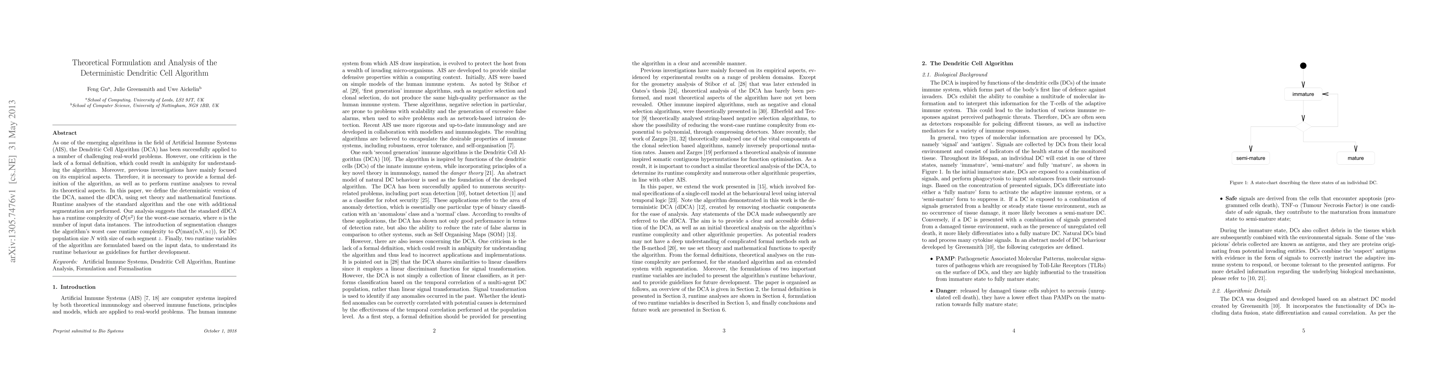 This paper formally defines the deterministic version of the Dendritic Cell Algorithm (dDCA) using set theory and mathematical functions, addressing previous ambiguities. It conducts runtime analyses revealing the standard dDCA has a worst-case complexity of O(n²), while segmentation alters this to O(max(nN; nz)), providing guidelines for future algorithm development.