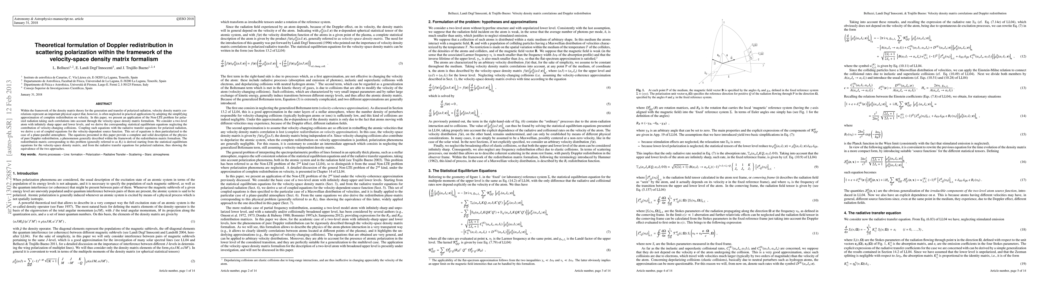 This paper formulates the Doppler redistribution in scattering polarization using the velocity-space density matrix formalism, providing a detailed treatment of velocity density matrix correlations in Non-LTE conditions. It derives coupled equations for the velocity-dependent source function and establishes the equivalence of the redistribution matrix formalism with the density matrix approach.