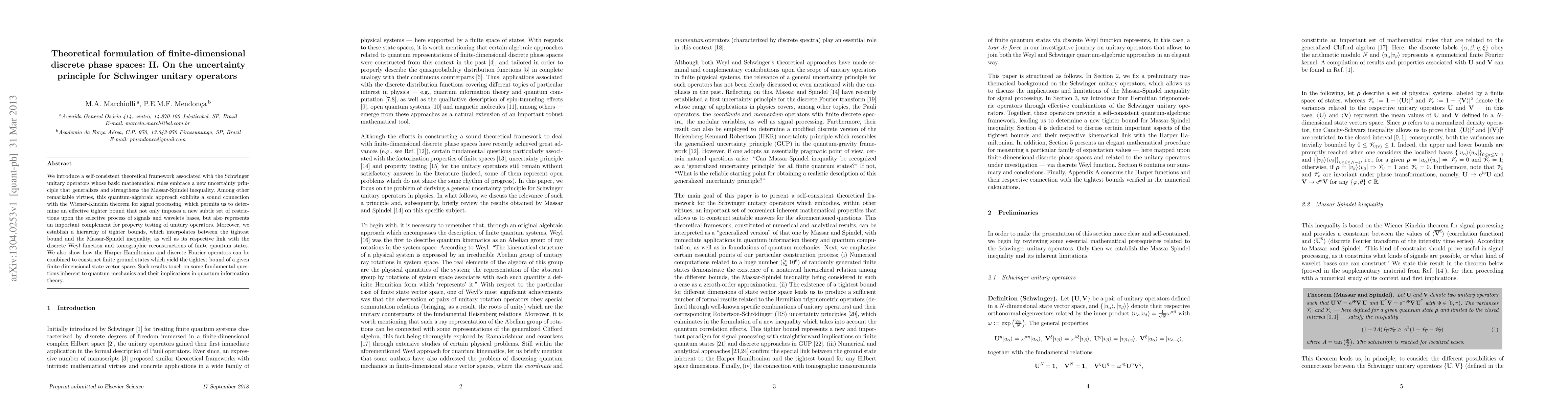 This paper develops a theoretical framework for finite-dimensional discrete phase spaces using Schwinger unitary operators, introducing a new uncertainty principle that generalizes the Massar-Spindel inequality. It establishes a tighter bound for signal processing and explores its implications for quantum information theory, including connections to the Wiener-Kinchin theorem and the construction of finite ground states.