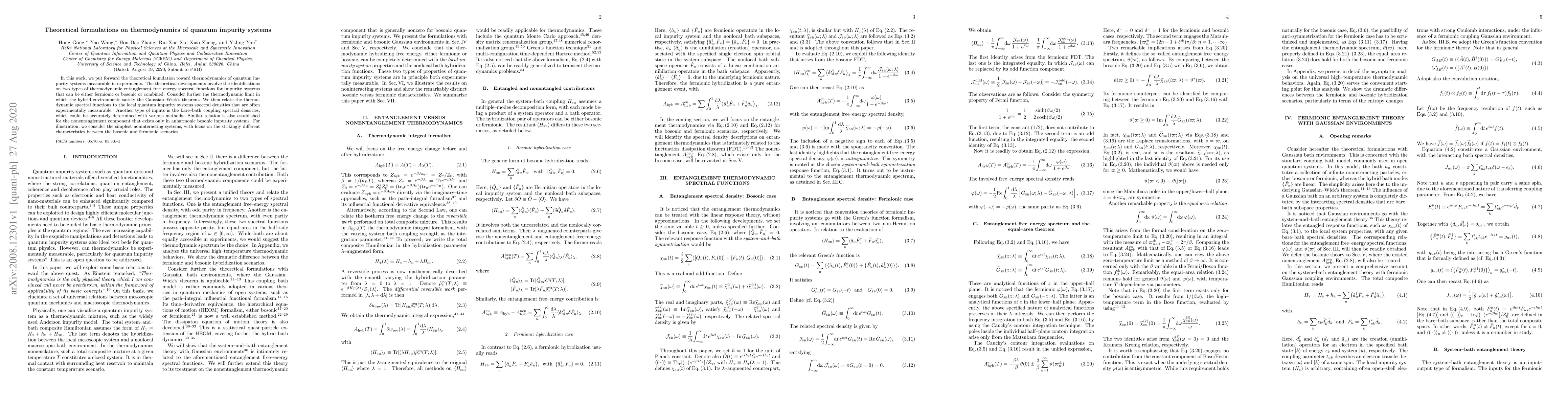 In this work, we put forward the theoretical foundation toward thermodynamics of quantum impurity systems measurable in experiments. The theoretical developments involve the identifications on two types of thermodynamic entanglement free--energy spectral functions for impurity systems that can be either fermionic or bosonic or combined. Consider further the thermodynamic limit in which the hybrid environments satisfy the Gaussian--Wick's theorem. We then relate the thermodynamic spectral functions to the local quantum impurity systems spectral densities that are often experimentally measurable. Another type of inputs is the bare--bath coupling spectral densities, which could be accurately determined with various methods. Similar relation is also established for the nonentanglement component that exists only in anharmonic bosonic impurity systems. For illustration, we consider the simplest noninteracting systems, with focus on the strikingly different characteristics between the bosonic and fermionic scenarios.