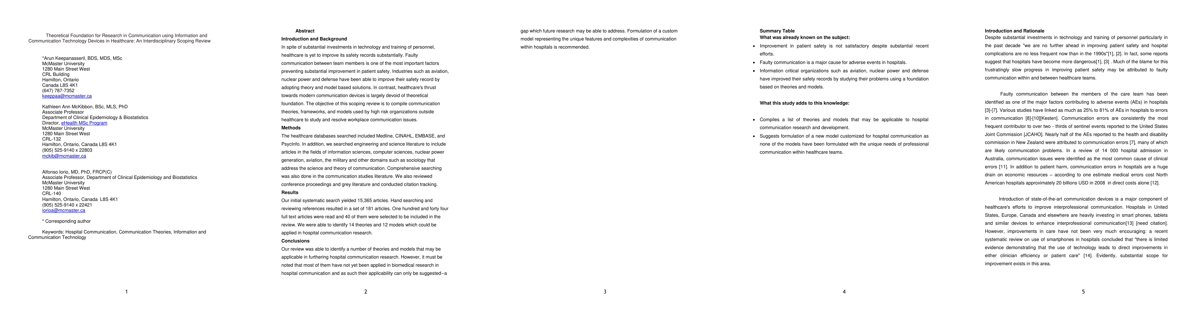 Faulty communication between team members is one of the most important factors preventing substantial improvement in patient safety. Aviation, nuclear power and defense have been able to improve their safety record by adopting theory and model based solutions. In contrast, healthcare's thrust towards modern communication devices is largely devoid of theoretical foundation. The objective of this scoping review is to compile communication theories, frameworks, and models used by high risk organizations outside healthcare to study and resolve workplace communication issues. The healthcare databases searched included Medline, CINAHL, EMBASE, and PsycInfo. In addition, we searched engineering and science literature to include articles in the fields of information sciences, computer sciences, nuclear power generation, aviation, the military and other domains such as sociology that address the science and theory of communication. Comprehensive searching was also done in the communication studies literature. We also reviewed conference proceedings and grey literature and conducted citation tracking. Our initial systematic search yielded 15,365 articles. Hand searching and reviewing references resulted in a set of 181 articles. 144 full text articles were read and 40 of them were selected to be included in the review. We were able to identify 14 theories and 12 models which could be applied in hospital communication research. However, it must be noted that most of them have not yet been applied in biomedical research in hospital communication and as such their applicability can only be suggested-a gap which future research may be able to address. Formulation of a custom model representing the unique features and complexities of communication within hospitals is recommended.