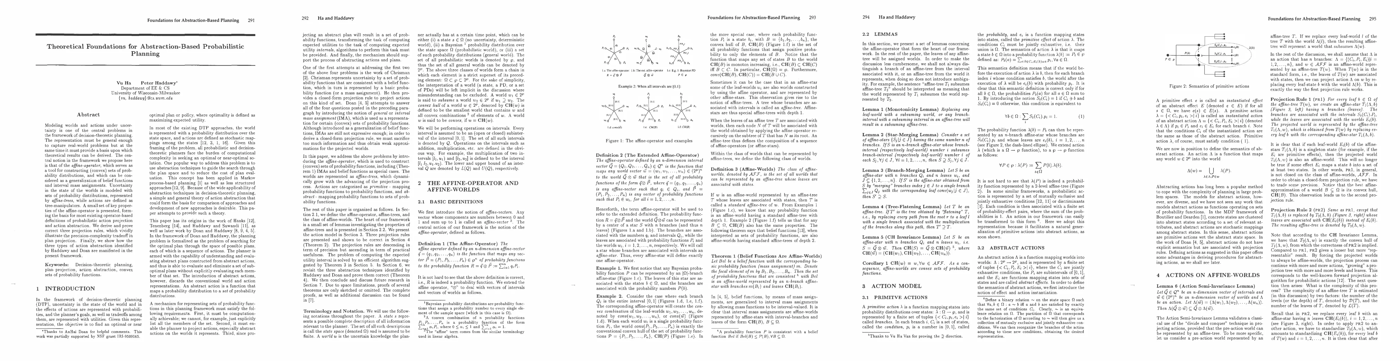 This paper introduces a theoretical framework for abstraction-based probabilistic planning using affine-operators to model uncertainty. It proposes affine-trees for representing sets of probability distributions and tree-manipulators for actions, deriving three projection rules that illustrate the precision-complexity tradeoff in plan projection.