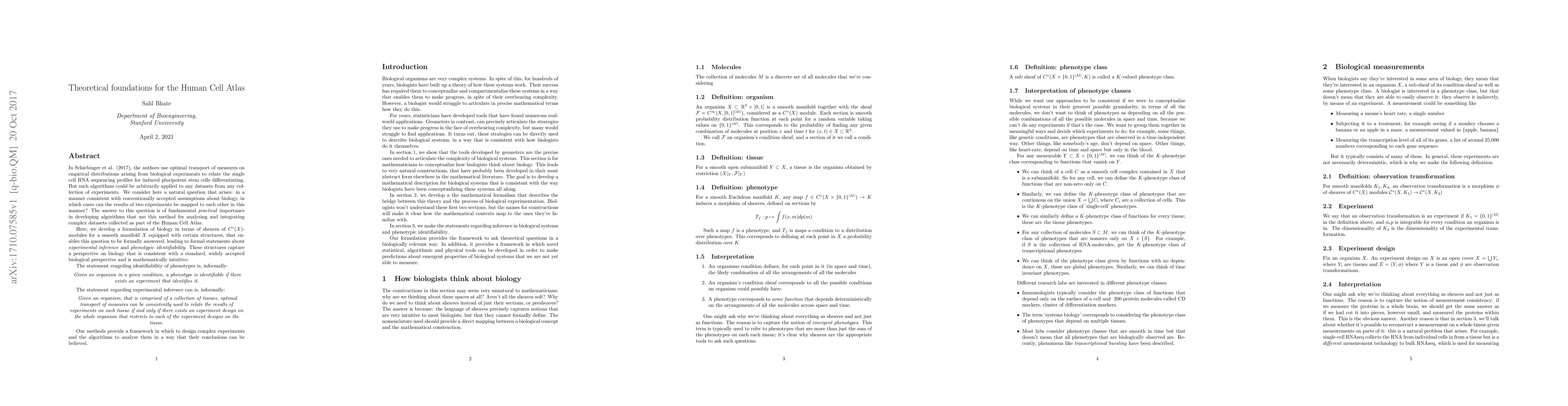 In Schiebinger et al. (2017), the authors use optimal transport of measures on empirical distributions arising from biological experiments to relate the single cell RNA sequencing profiles for induced pluripotent stem cells differentiating. But such algorithms could be arbitrarily applied to any datasets from any collection of experiments. We consider here a natural question that arises: in a manner consistent with conventionally accepted assumptions about biology, in which cases can the results of two experiments be mapped to each other in this manner? The answer to this question is of fundamental practical importance in developing algorithms that use this method for analysing and integrating complex datasets collected as part of the Human Cell Atlas. Here, we develop a formulation of biology in terms of sheaves of $C^*(X)$-modules for a smooth manifold $X$ equipped with certain structures, that enables this question to be formally answered, leading to formal statements about experimental inference and phenotypic identifiability. These structures capture a perspective on biology that is consistent with a standard, widely accepted biological perspective and is mathematically intuitive. Our methods provide a framework in which to design complex experiments and the algorithms to analyse them in a way that their conclusions can be believed.