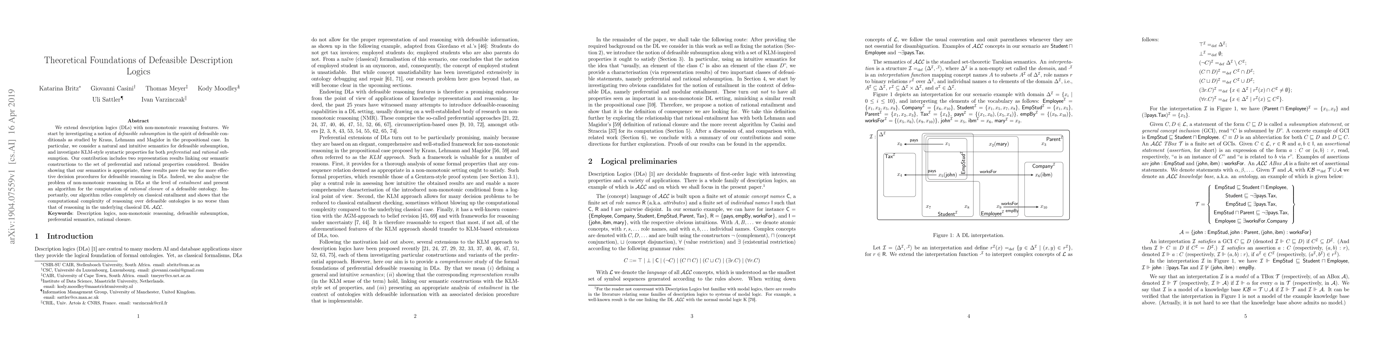 This paper extends description logics with non-monotonic reasoning by introducing defeasible subsumption akin to defeasible conditionals, providing both preferential and rational semantics, and presenting an algorithm for computing the rational closure of defeasible ontologies, maintaining complexity comparable to classical DL ALC.