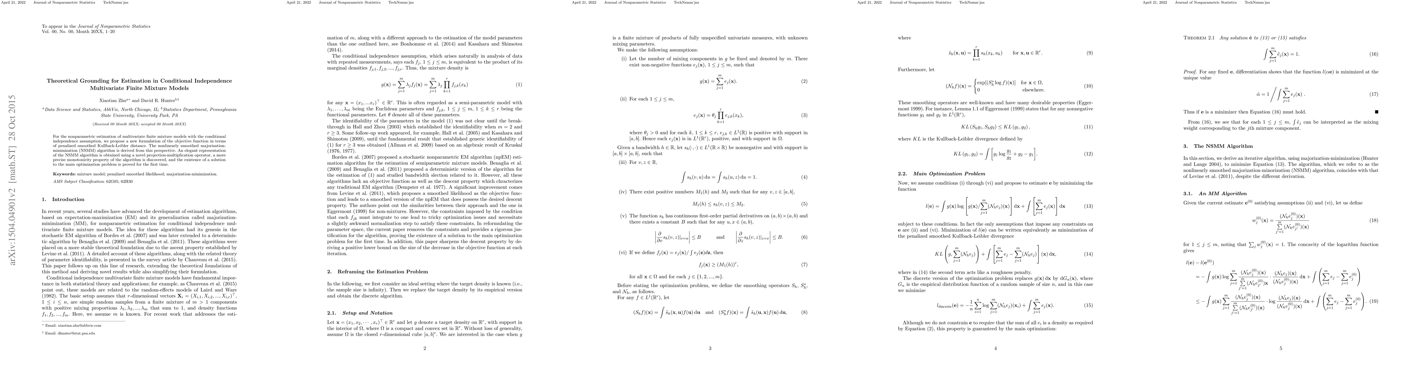 This paper proposes a new objective function for estimating multivariate finite mixture models under conditional independence, utilizing penalized smoothed Kullback-Leibler distance. It introduces a nonlinearly smoothed majorization-minimization (NSMM) algorithm, proves its monotonicity, and establishes the existence of a solution to the optimization problem.