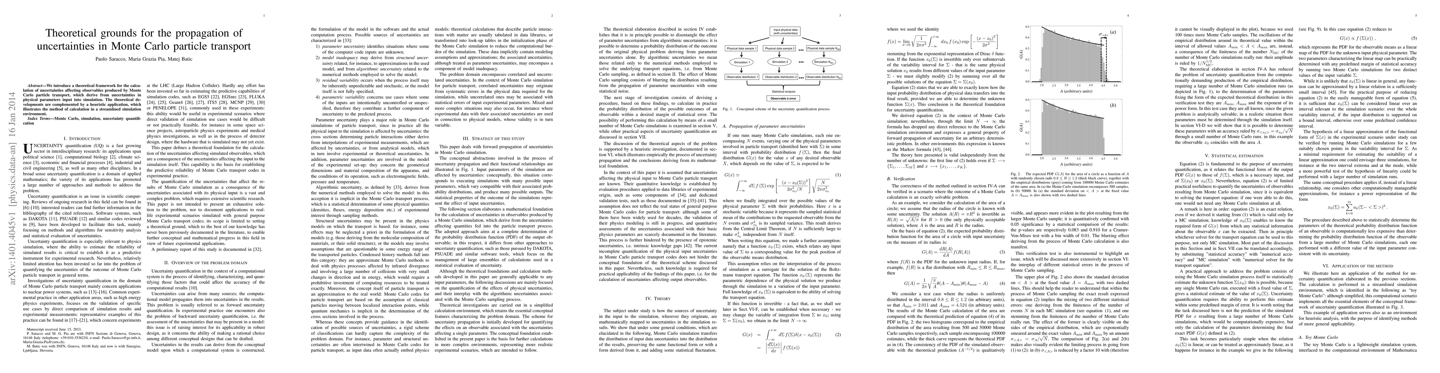 This paper presents a theoretical framework for quantifying uncertainties in Monte Carlo particle transport simulations, stemming from input parameter uncertainties, and demonstrates its application through a heuristic example in a simplified simulation setting.