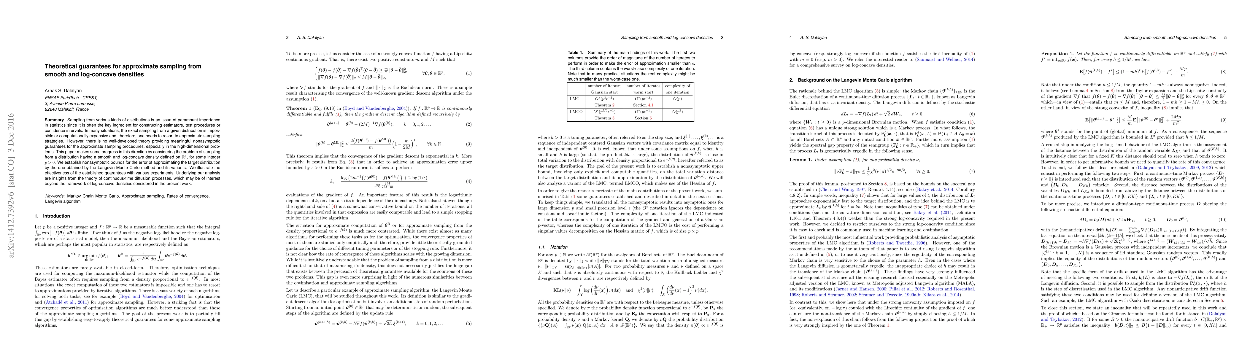 Sampling from various kinds of distributions is an issue of paramount importance in statistics since it is often the key ingredient for constructing estimators, test procedures or confidence intervals. In many situations, the exact sampling from a given distribution is impossible or computationally expensive and, therefore, one needs to resort to approximate sampling strategies. However, there is no well-developed theory providing meaningful nonasymptotic guarantees for the approximate sampling procedures, especially in the high-dimensional problems. This paper makes some progress in this direction by considering the problem of sampling from a distribution having a smooth and log-concave density defined on \(\RR^p\), for some integer \(p>0\). We establish nonasymptotic bounds for the error of approximating the target distribution by the one obtained by the Langevin Monte Carlo method and its variants. We illustrate the effectiveness of the established guarantees with various experiments. Underlying our analysis are insights from the theory of continuous-time diffusion processes, which may be of interest beyond the framework of log-concave densities considered in the present work.