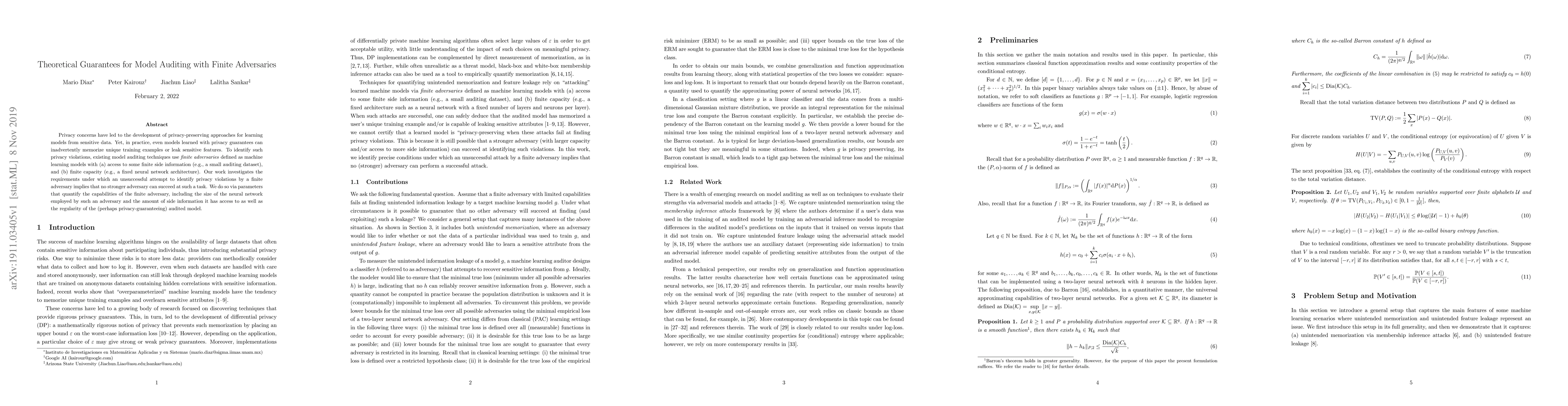 Privacy concerns have led to the development of privacy-preserving approaches for learning models from sensitive data. Yet, in practice, even models learned with privacy guarantees can inadvertently memorize unique training examples or leak sensitive features. To identify such privacy violations, existing model auditing techniques use finite adversaries defined as machine learning models with (a) access to some finite side information (e.g., a small auditing dataset), and (b) finite capacity (e.g., a fixed neural network architecture). Our work investigates the requirements under which an unsuccessful attempt to identify privacy violations by a finite adversary implies that no stronger adversary can succeed at such a task. We do so via parameters that quantify the capabilities of the finite adversary, including the size of the neural network employed by such an adversary and the amount of side information it has access to as well as the regularity of the (perhaps privacy-guaranteeing) audited model.