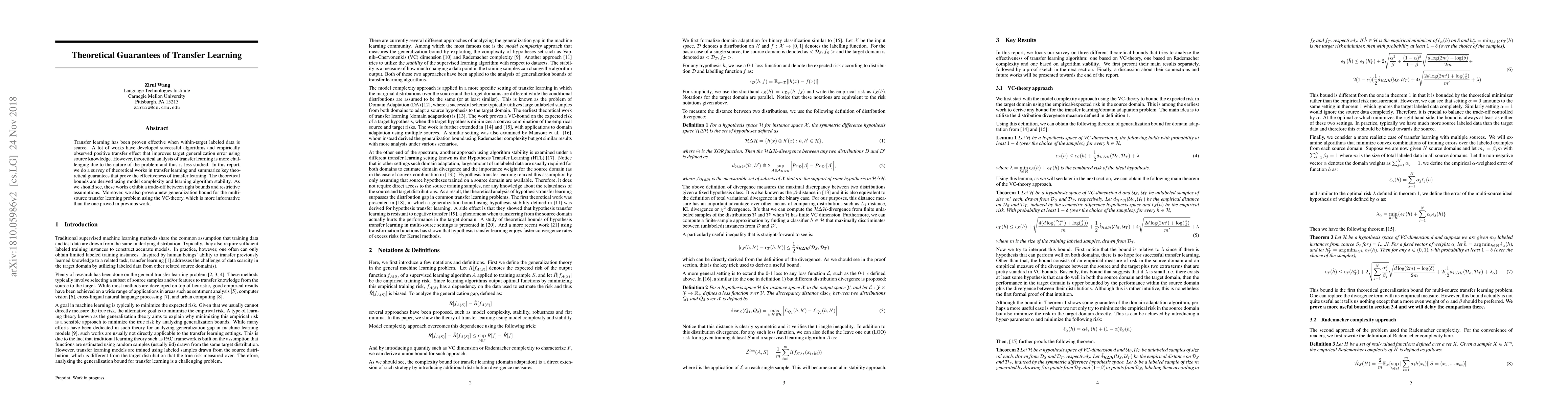 Transfer learning has been proven effective when within-target labeled data is scarce. A lot of works have developed successful algorithms and empirically observed positive transfer effect that improves target generalization error using source knowledge. However, theoretical analysis of transfer learning is more challenging due to the nature of the problem and thus is less studied. In this report, we do a survey of theoretical works in transfer learning and summarize key theoretical guarantees that prove the effectiveness of transfer learning. The theoretical bounds are derived using model complexity and learning algorithm stability. As we should see, these works exhibit a trade-off between tight bounds and restrictive assumptions. Moreover, we also prove a new generalization bound for the multi-source transfer learning problem using the VC-theory, which is more informative than the one proved in previous work.