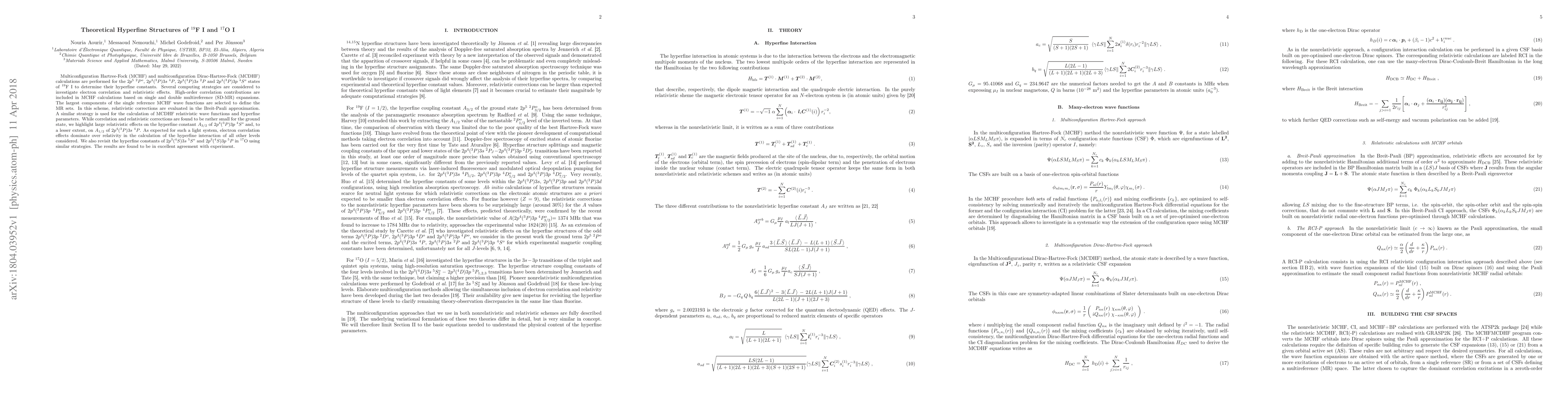 Multiconfiguration Hartree-Fock (MCHF) and multiconfiguration Dirac-Hartree-Fock (MCDHF) calculations are performed for the $2p^{5}~^{2}P^{o}$, $2p^4(^{3}P)3s~^{4}P$, $2p^4(^{3}P)3s~^{2}P$ and $2p^4(^{3}P)3p~^{4}S^o$ states of $^{19}$F~I to determine their hyperfine constants. Several computing strategies are considered to investigate electron correlation and relativistic effects. High-order correlation contributions are included in MCHF calculations based on single and double multireference (SD-MR) expansions. The largest components of the single reference MCHF wave functions are selected to define the MR sets. In this scheme, relativistic corrections are evaluated in the Breit-Pauli approximation. A similar strategy is used for the calculation of MCDHF relativistic wave functions and hyperfine parameters. While correlation and relativistic corrections are found to be rather small for the ground state, we highlight large relativistic effects on the hyperfine constant $A_{3/2}$ of $2p^4(^{3}P)3p~^{4}S^o$ and, to a lesser extent, on $A_{1/2}$ of $2p^4(^{3}P)3s~^{4}P$. As expected for such a light system, electron correlation effects dominate over relativity in the calculation of the hyperfine interaction of all other levels considered. We also revisit the hyperfine constants of $2p^3(^{4}S)3s~^{5}S^{o}$ and $2p^3(^{4}S)3p~^{5}P$ in $^{17}$O using similar strategies. The results are found to be in excellent agreement with experiment.