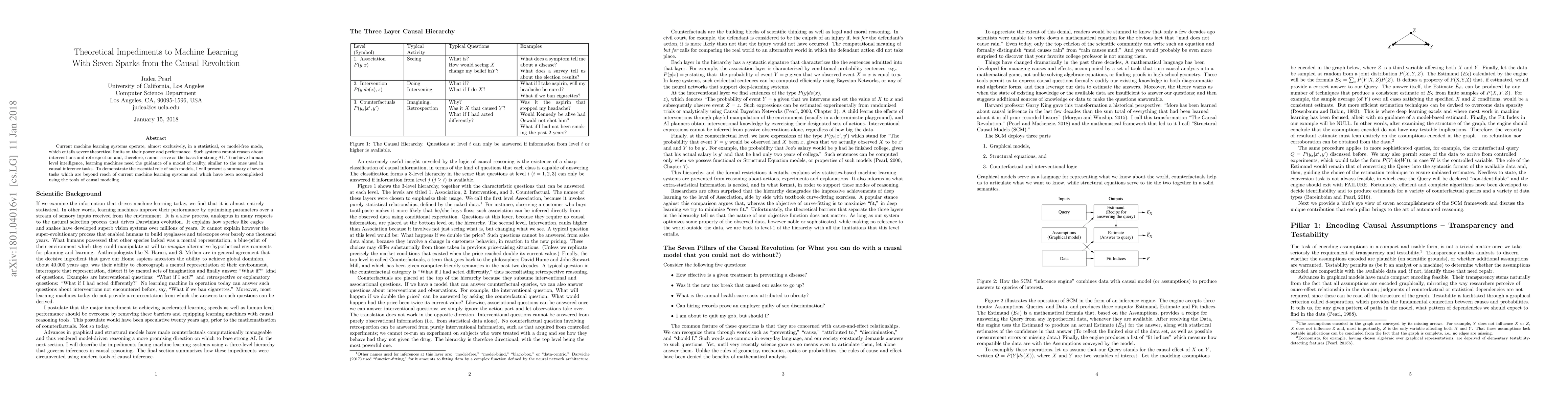 Current machine learning systems operate, almost exclusively, in a statistical, or model-free mode, which entails severe theoretical limits on their power and performance. Such systems cannot reason about interventions and retrospection and, therefore, cannot serve as the basis for strong AI. To achieve human level intelligence, learning machines need the guidance of a model of reality, similar to the ones used in causal inference tasks. To demonstrate the essential role of such models, I will present a summary of seven tasks which are beyond reach of current machine learning systems and which have been accomplished using the tools of causal modeling.