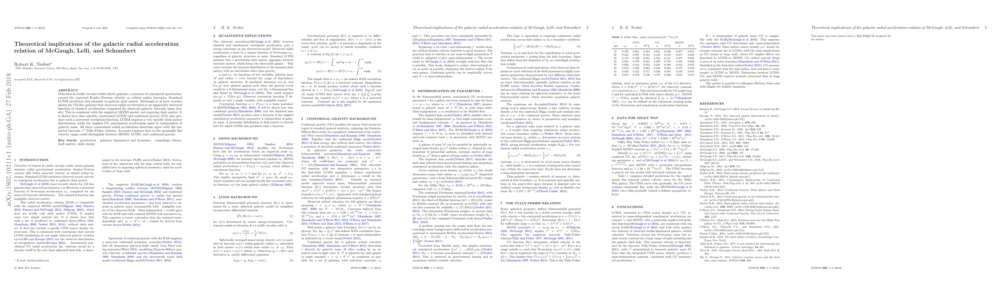 Velocities in stable circular orbits about galaxies, a measure of centripetal gravitation, exceed the expected Kepler/Newton velocity as orbital radius increases. Standard LCDM attributes this anomaly to galactic dark matter. McGaugh et al have recently shown for 153 disc galaxies that observed radial acceleration is an apparently universal function of classical acceleration computed for observed galactic baryonic mass density. This is consistent with the empirical MOND model, not requiring dark matter. It is shown here that suitably constrained LCDM and conformal gravity (CG) also produce such a universal correlation function. LCDM requires a very specific dark matter distribution, while the implied CG nonclassical acceleration must be independent of galactic mass. All three constrained radial acceleration functions agree with the empirical baryonic $v^4$ Tully-Fisher relation. Accurate rotation data in the nominally flat velocity range could distinguish between MOND, LCDM, and conformal gravity.
