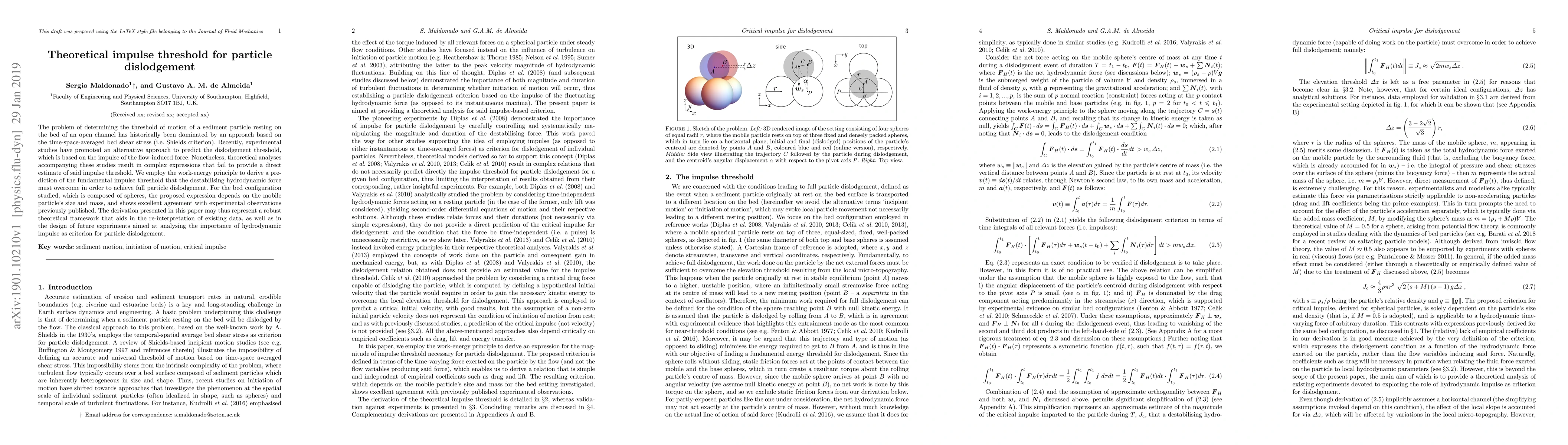 The problem of determining the threshold of motion of a sediment particle resting on the bed of an open channel has historically been dominated by an approach based on the time-space-averaged bed shear stress (i.e. Shields criterion). Recently, experimental studies have promoted an alternative approach to predict the dislodgement threshold, which is based on the impulse of the flow-induced force. Nonetheless, theoretical analyses accompanying these studies result in complex expressions that fail to provide a direct estimate of said impulse threshold. We employ the work-energy principle to derive a prediction of the fundamental impulse threshold that the destabilising hydrodynamic force must overcome in order to achieve full particle dislodgement. For the bed configuration studied, which is composed of spheres, the proposed expression depends on the mobile particle's size and mass, and shows excellent agreement with experimental observations previously published. The derivation presented in this paper may thus represent a robust theoretical framework that aids in the re-interpretation of existing data, as well as in the design of future experiments aimed at analysing the importance of hydrodynamic impulse as criterion for prediction of particle dislodgement.