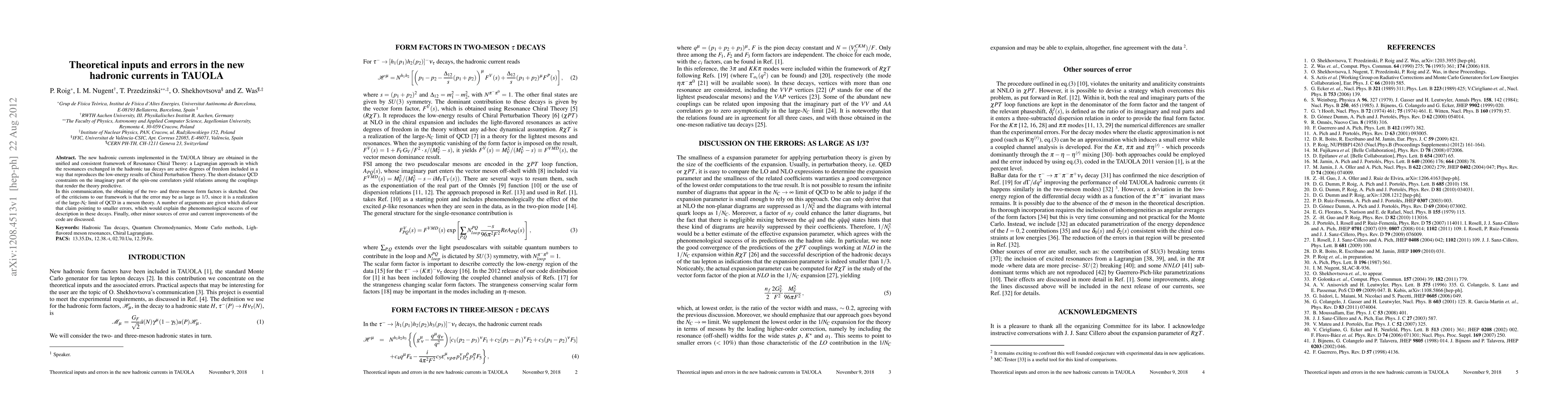 The new hadronic currents implemented in the TAUOLA library are obtained in the unified and consistent framework of Resonance Chiral Theory: a Lagrangian approach in which the resonances exchanged in the hadronic tau decays are active degrees of freedom included in a way that reproduces the low-energy results of Chiral Perturbation Theory. The short-distance QCD constraints on the imaginary part of the spin-one correlators yield relations among the couplings that render the theory predictive. In this communication, the obtaining of the two- and three-meson form factors is sketched. One of the criticisms to our framework is that the error may be as large as 1/3, since it is a realization of the large-N_C limit of QCD in a meson theory. A number of arguments are given which disfavor that claim pointing to smaller errors, which would explain the phenomenological success of our description in these decays. Finally, other minor sources of error and current improvements of the code are discussed.