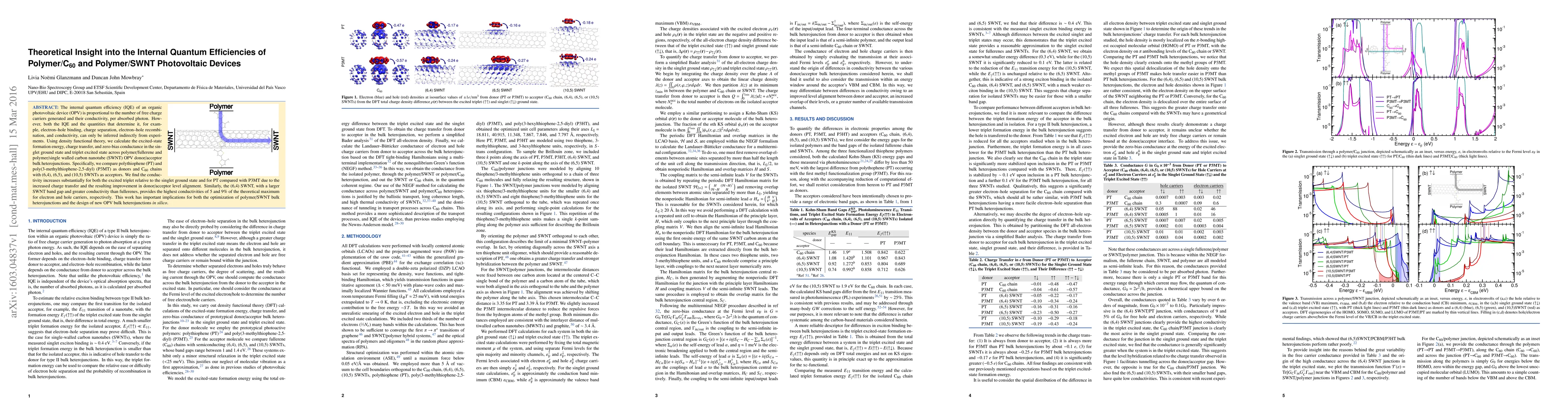 The internal quantum efficiency (IQE) of an organic photovoltaic device (OPV) is proportional to the number of free charge carriers generated and their conductivity, per absorbed photon. However, both the IQE and the quantities that determine it, for example, electron-hole binding, charge separation, electron-hole recombination, and conductivity, can only be inferred indirectly from experiments. Using density functional theory, we calculate the excited-state formation energy, charge transfer, and zero-bias conductance in the singlet ground state and triplet excited state across polymer/fullerene and polymer/single walled carbon nanotube (SWNT) OPV donor/acceptor bulk heterojunctions. Specifically, we compare polythiophene (PT) and poly(3-methylthiophene-2,5-diyl) (P3MT) as donors and C$_{60}$ chains with (6,4), (6,5), and (10,5) SWNTs as acceptors. We find the conductivity increases substantially for both the excited triplet relative to the singlet ground state and for PT compared with P3MT due to the increased charge transfer and the resulting improvement in donor/acceptor level alignment. Similarly, the (6,4) SWNT, with a larger SWNT band gap and greater conductivity than fullerenes, provides the highest conductivities of 5 and 9\% of the theoretical maximum for electron and hole carriers, respectively. This work has important implications for both the optimization of polymer/SWNT bulk heterojunctions and the design of new OPV bulk heterojunctions in silico.
