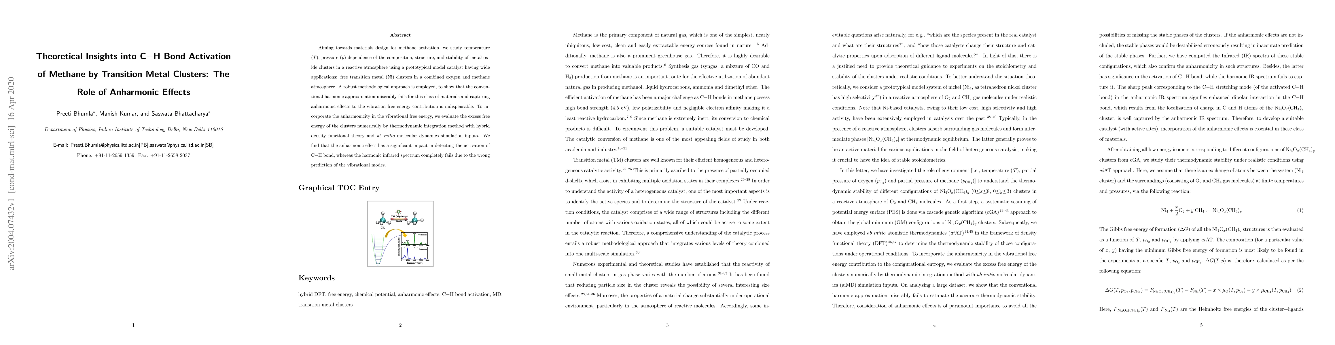 This paper investigates the temperature and pressure dependence of transition metal clusters, specifically Ni clusters, in a methane and oxygen atmosphere to understand methane activation. It finds that anharmonic effects significantly impact C$-$H bond activation, while the harmonic approximation fails to predict the vibrational modes accurately.