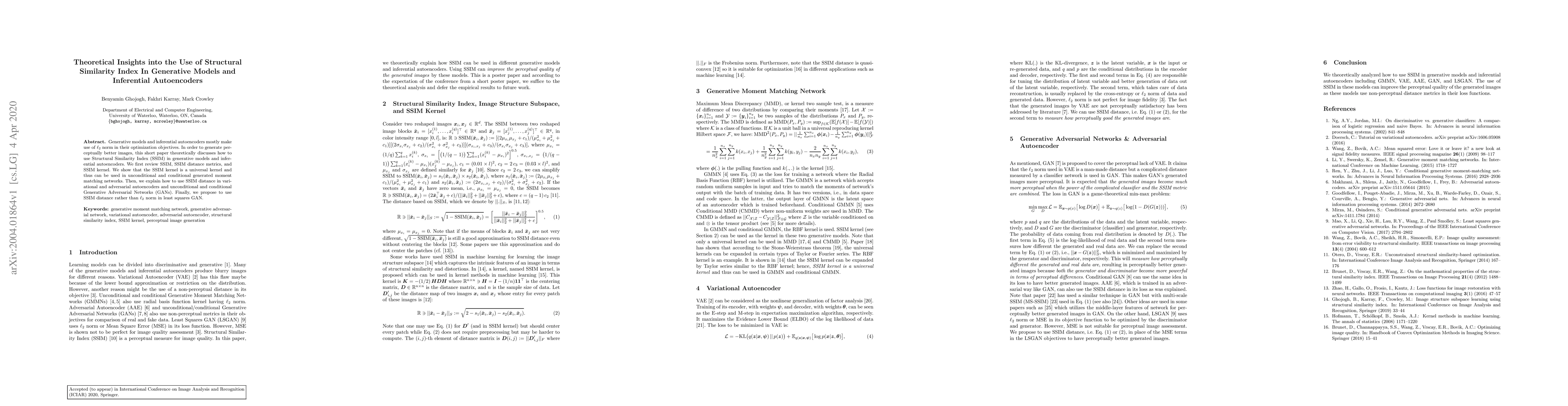 This paper explores the theoretical application of the Structural Similarity Index (SSIM) in generative models and inferential autoencoders, proposing its use over traditional $\ell_2$ norm for better perceptual image generation. It demonstrates SSIM's potential as a universal kernel and discusses its integration into various generative and autoencoder frameworks.