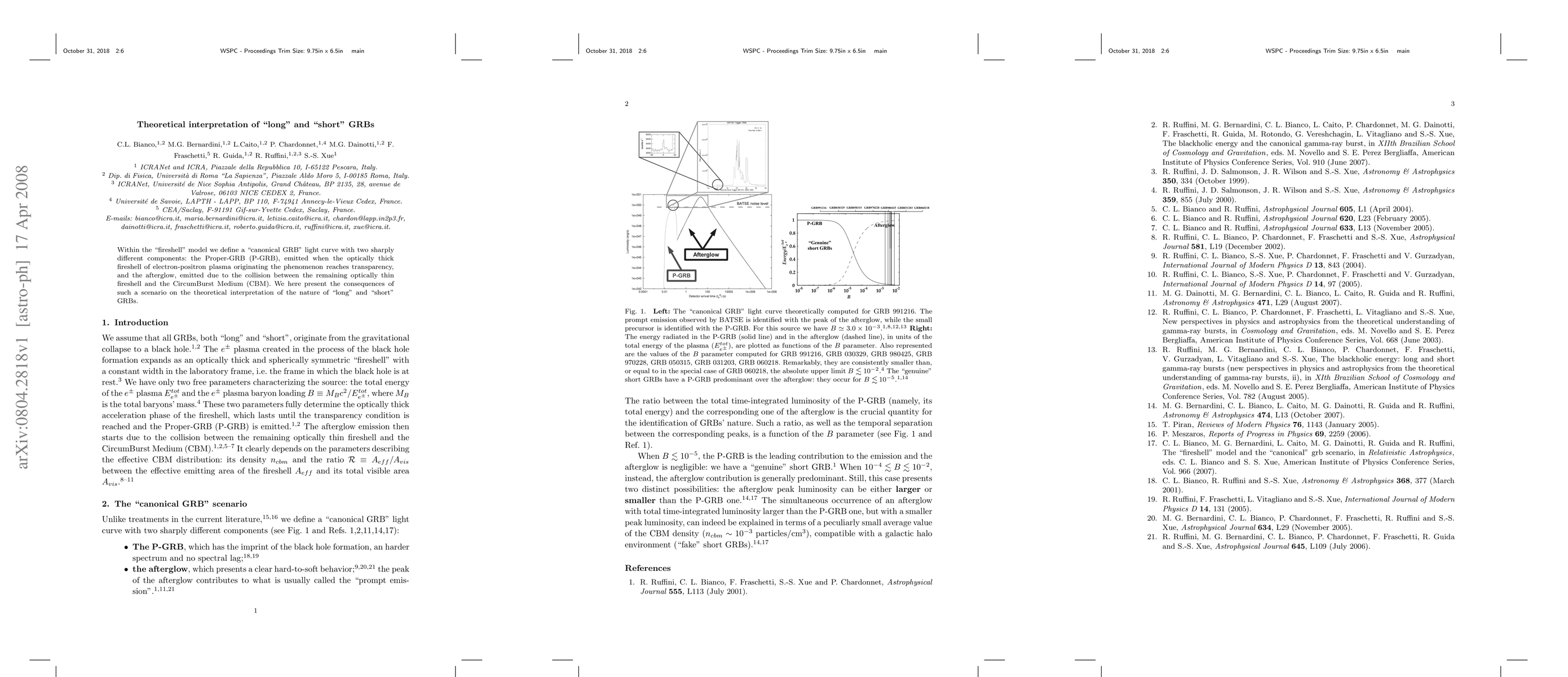 Within the "fireshell" model we define a "canonical GRB" light curve with two sharply different components: the Proper-GRB (P-GRB), emitted when the optically thick fireshell of electron-positron plasma originating the phenomenon reaches transparency, and the afterglow, emitted due to the collision between the remaining optically thin fireshell and the CircumBurst Medium (CBM). We here present the consequences of such a scenario on the theoretical interpretation of the nature of "long" and "short" GRBs.