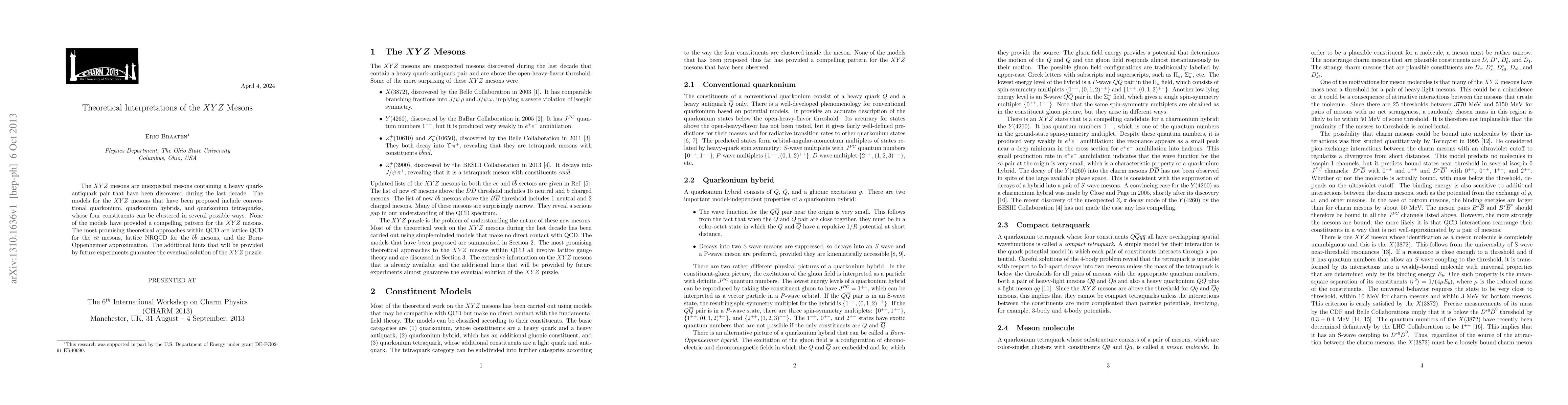 The XYZ mesons are unexpected mesons containing a heavy quark-antiquark pair that have been discovered during the last decade. The models for the XYZ mesons that have been proposed include conventional quarkonium, quarkonium hybrids, and quarkonium tetraquarks, whose four constituents can be clustered in several possible ways. None of the models have provided a compelling pattern for the XYZ mesons. The most promising theoretical approaches within QCD are lattice QCD for the c c-bar mesons, lattice NRQCD for the b b-bar mesons, and the Born-Oppenheimer approximation. The additional hints that will be provided by future experiments guarantee the eventual solution of the XYZ puzzle.