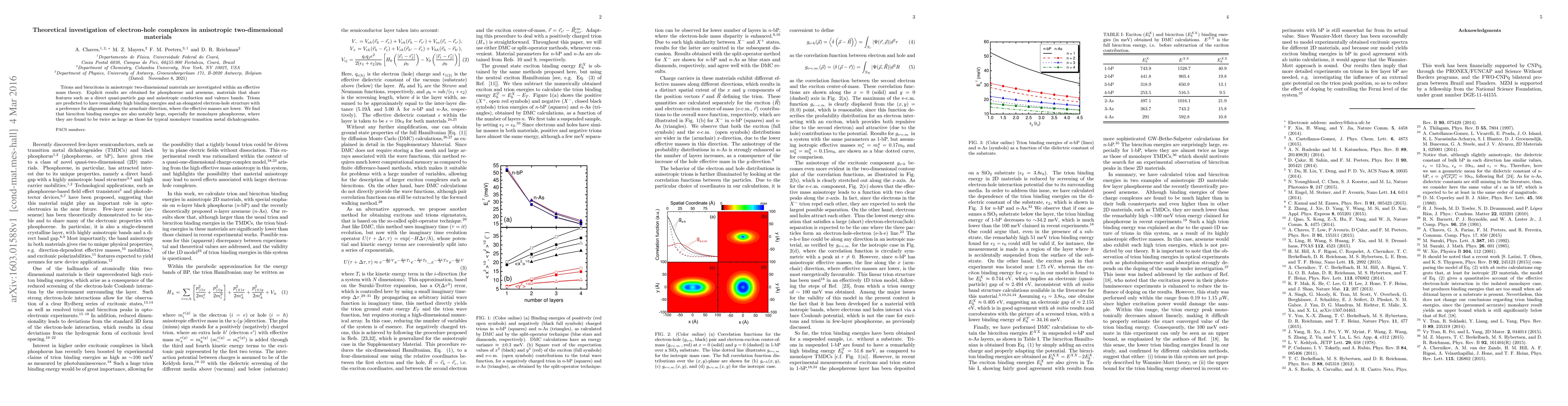 This paper investigates electron-hole complexes in anisotropic two-dimensional materials using effective mass theory, finding high binding energies for both trions and biexcitons, especially in phosphorene, where biexciton binding energies are twice as large as in typical transition metal dichalcogenides. Trions exhibit an elongated structure aligned along the armchair direction due to lower effective masses.